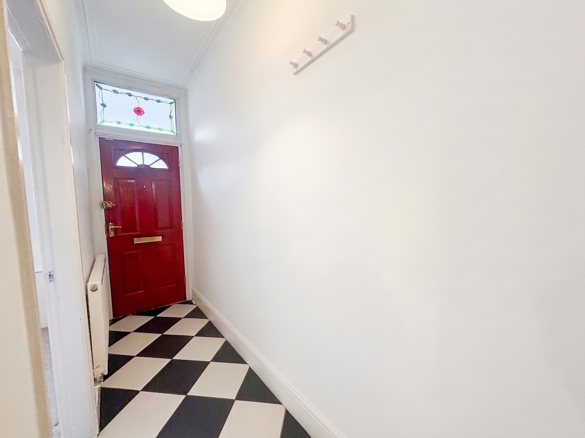 Black-and-white checkerboard tile flooring. Staircase leading to the first floor landing. Internal doors lead through to: