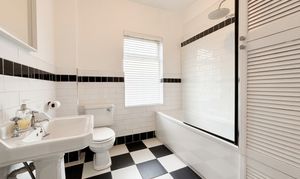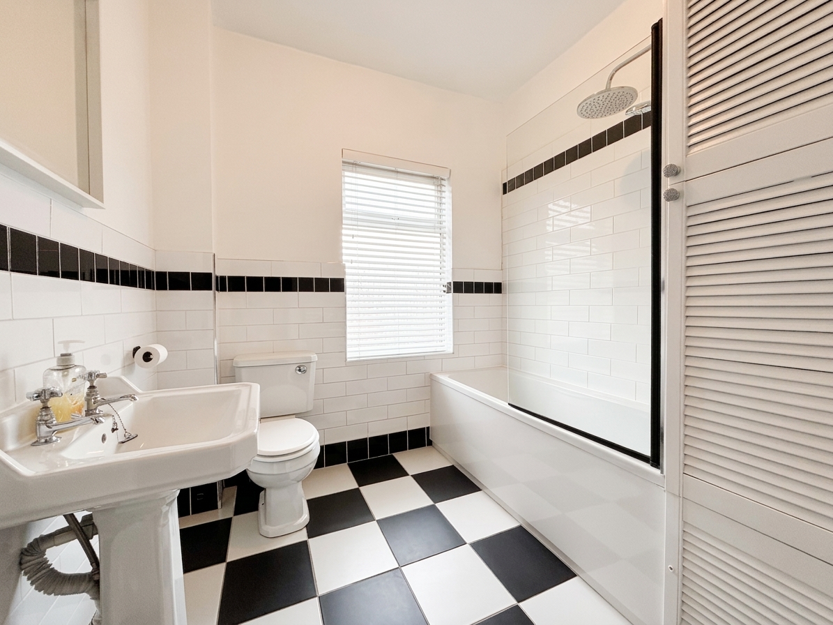 Window to the rear elevation. Fitted with a bath with shower over, low-level W.C. and hand wash basin. Fully tiled walls with black-and-white checkerboard tile flooring. Built-in storage cupboard.
