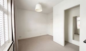 Window to the front elevation. Built-in wardrobe space fitted with hanging rails. Feature fireplace surround.
