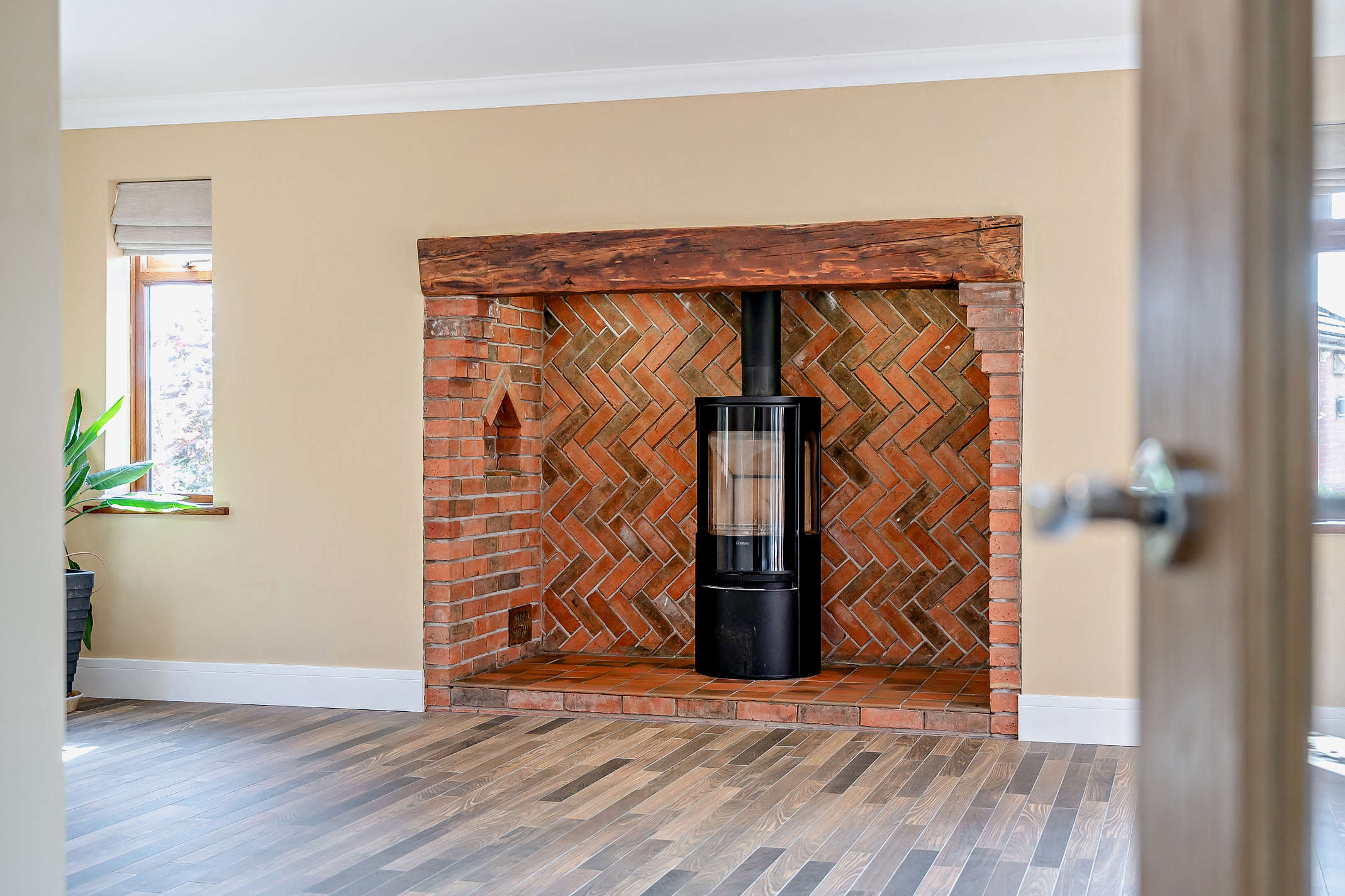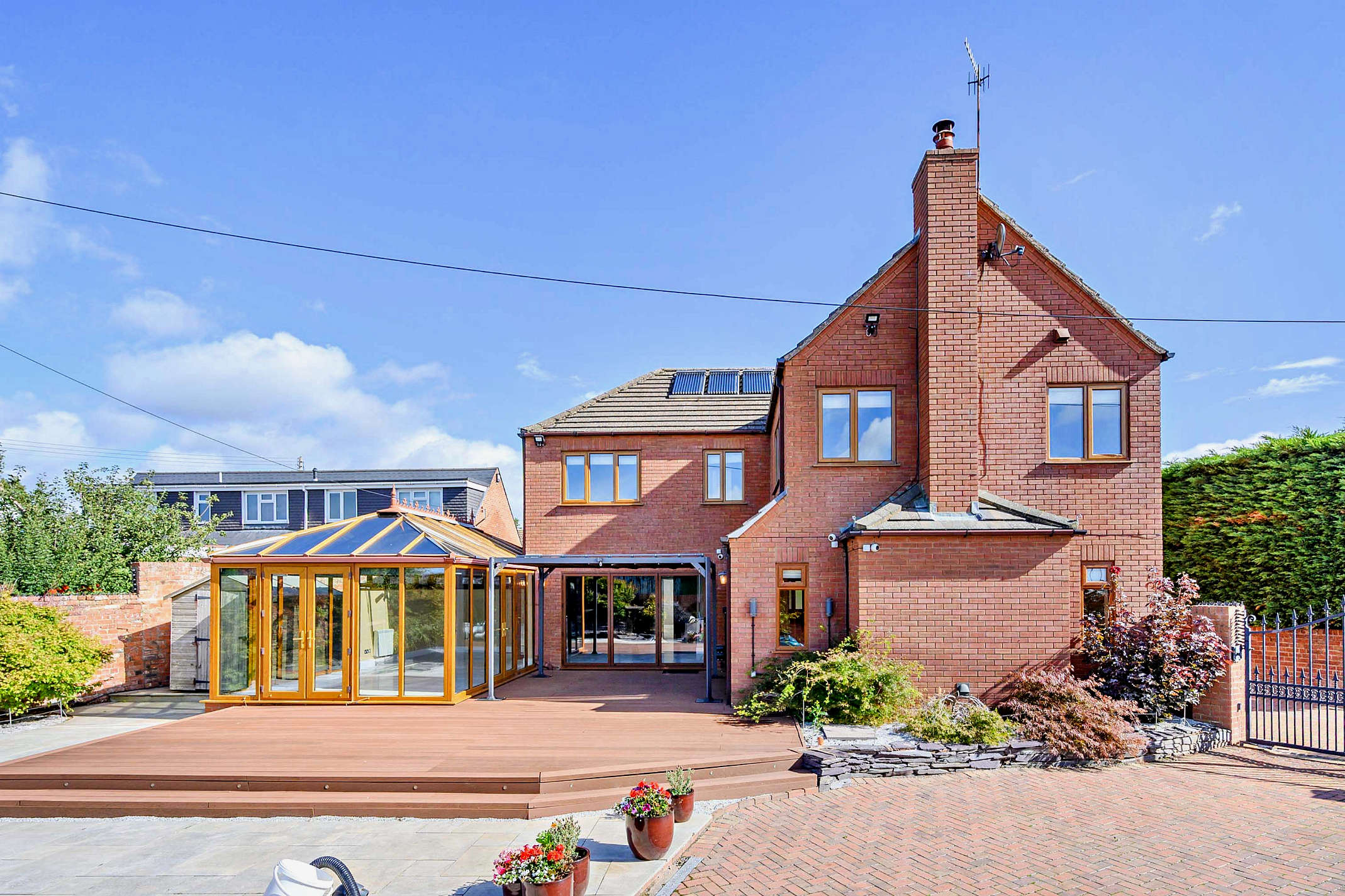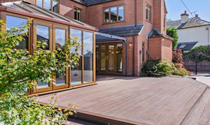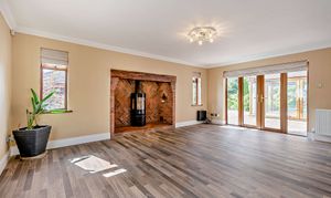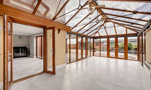 - Elegant lounge with inglenook fireplace and direct access to rear terrace; expansive conservatory with panoramic garden views and natural light