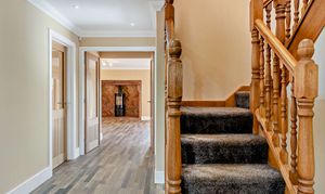 Upstairs, the galleried landing leads to five beautifully arranged bedrooms. The principal suite boasts panoramic countryside views and a luxurious en suite. Bedroom two features an en suite and dressing area, while bedroom three connects to a spacious dressing room that could easily serve as a fifth bedroom. A stylish family shower room completes the upper floor.