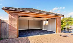 - Gated driveway with ample parking and detached double garage with storage