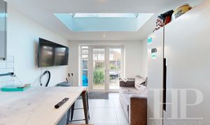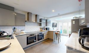 Communal kitchen shared between all tenants. White goods provided. Lounge space with sofa and TV. Door to rear garden.