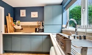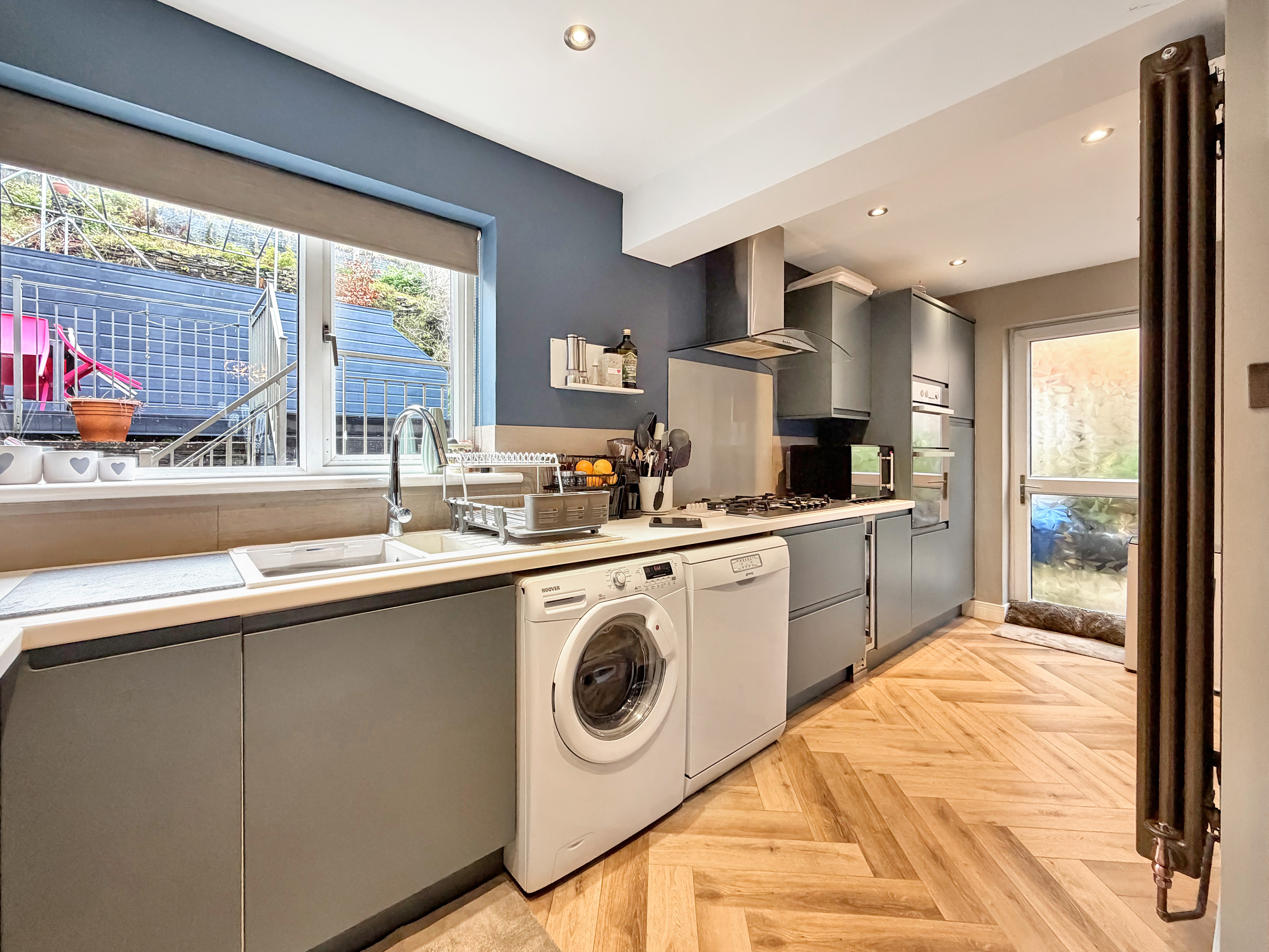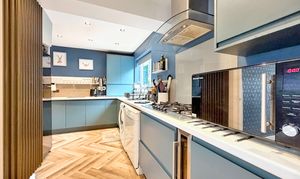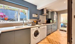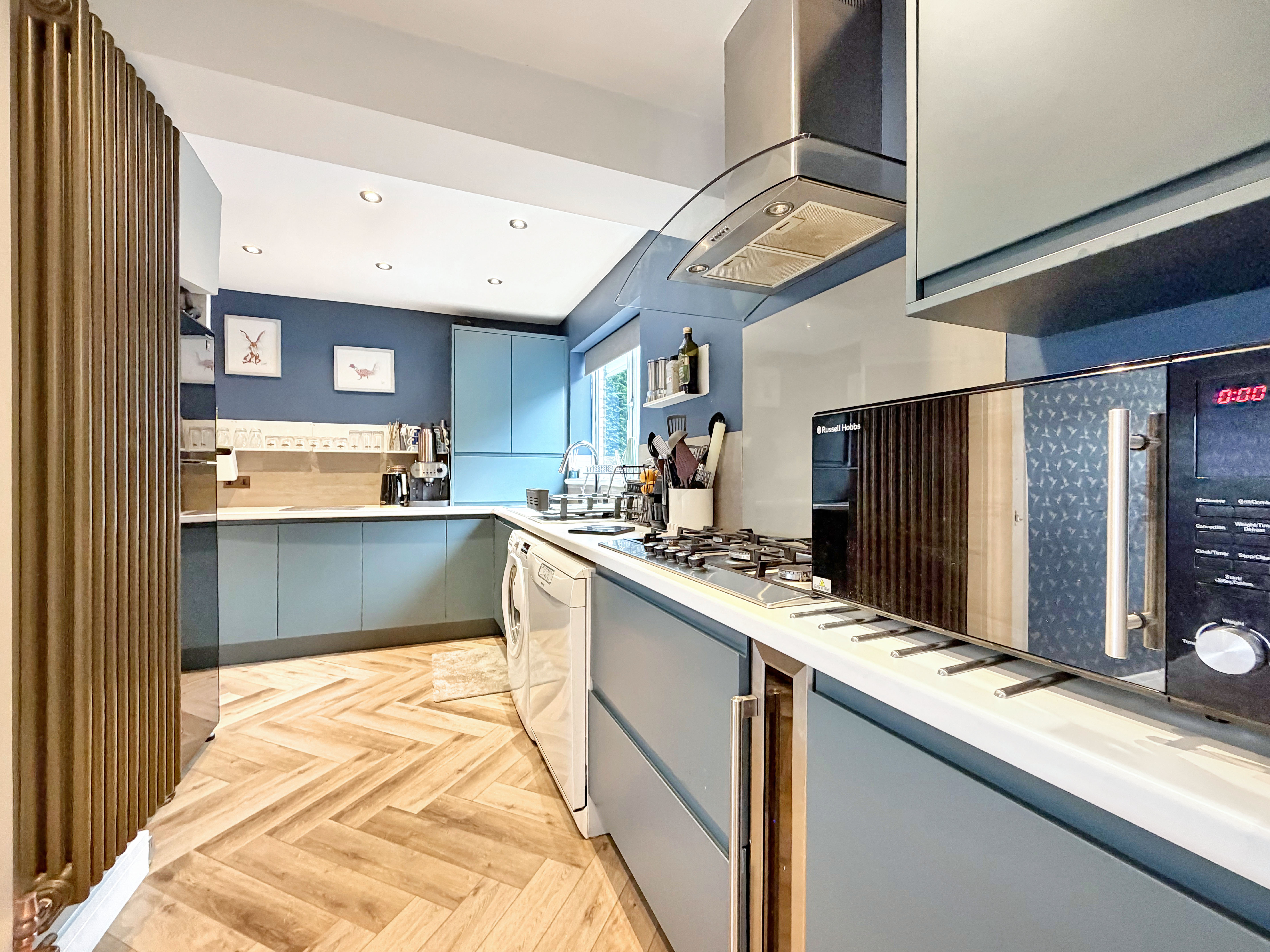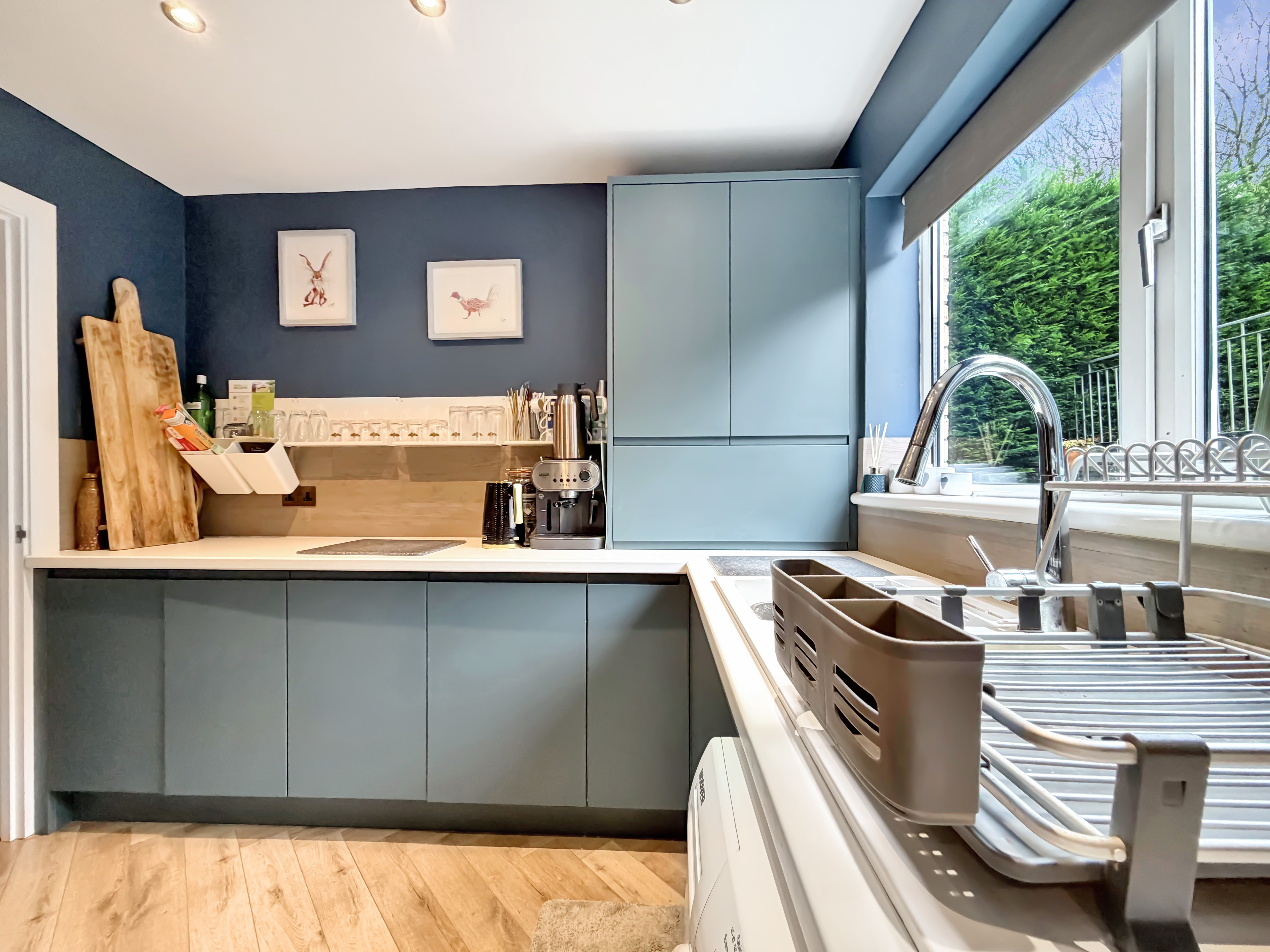 The beautifully specified kitchen comes complete with integrated appliances, sleek cabinetry and ample counter space, ensuring both style and functionality for daily meal preparation and social gatherings.