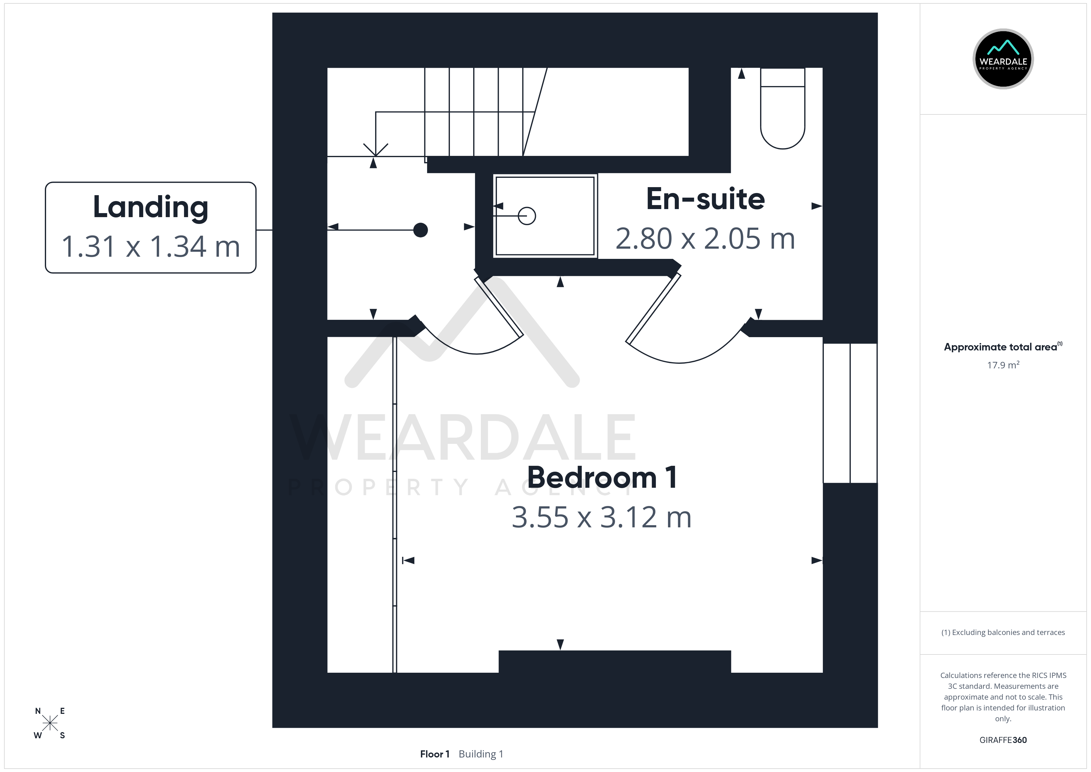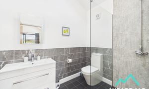 - Positioned to the front of the property and accessed directly from bedroom 1 - Shower cubicle with fully clad enclosure, glass door, and mains-fed shower with rainfall head - WC - Hand-wash basin set on vanity unit with integrated shelving below - Wall mounted corner storage unit with mirrored front - Extractor fan - LVT flooring - Vertical heated towel rail - Ceiling spotlights