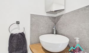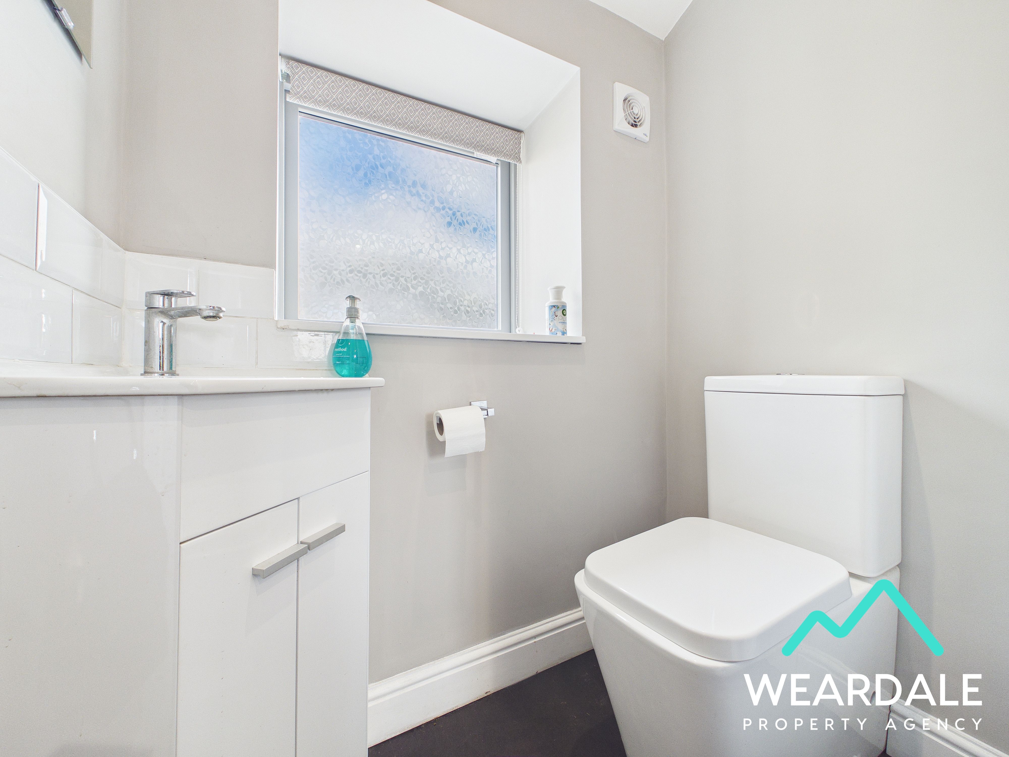 - Located to the rear of the property and accessed from the rear porch - Wooden framed double-glazed window with frosted pane to the Northern aspect - WC - Corner hand-wash basin with tiled splashback, set on vanity unit within integrated storage below - Extractor fan - LVT flooring - Radiator - Ceiling spotlight