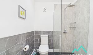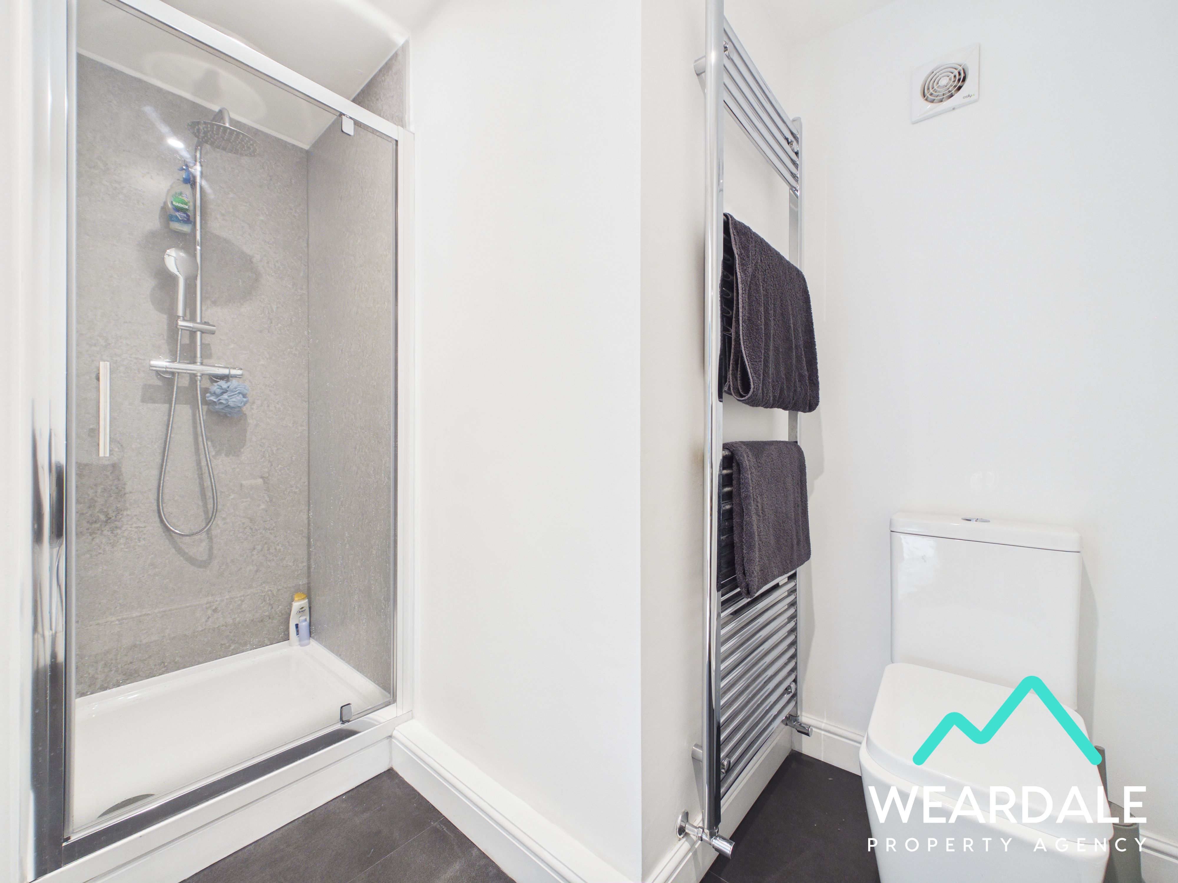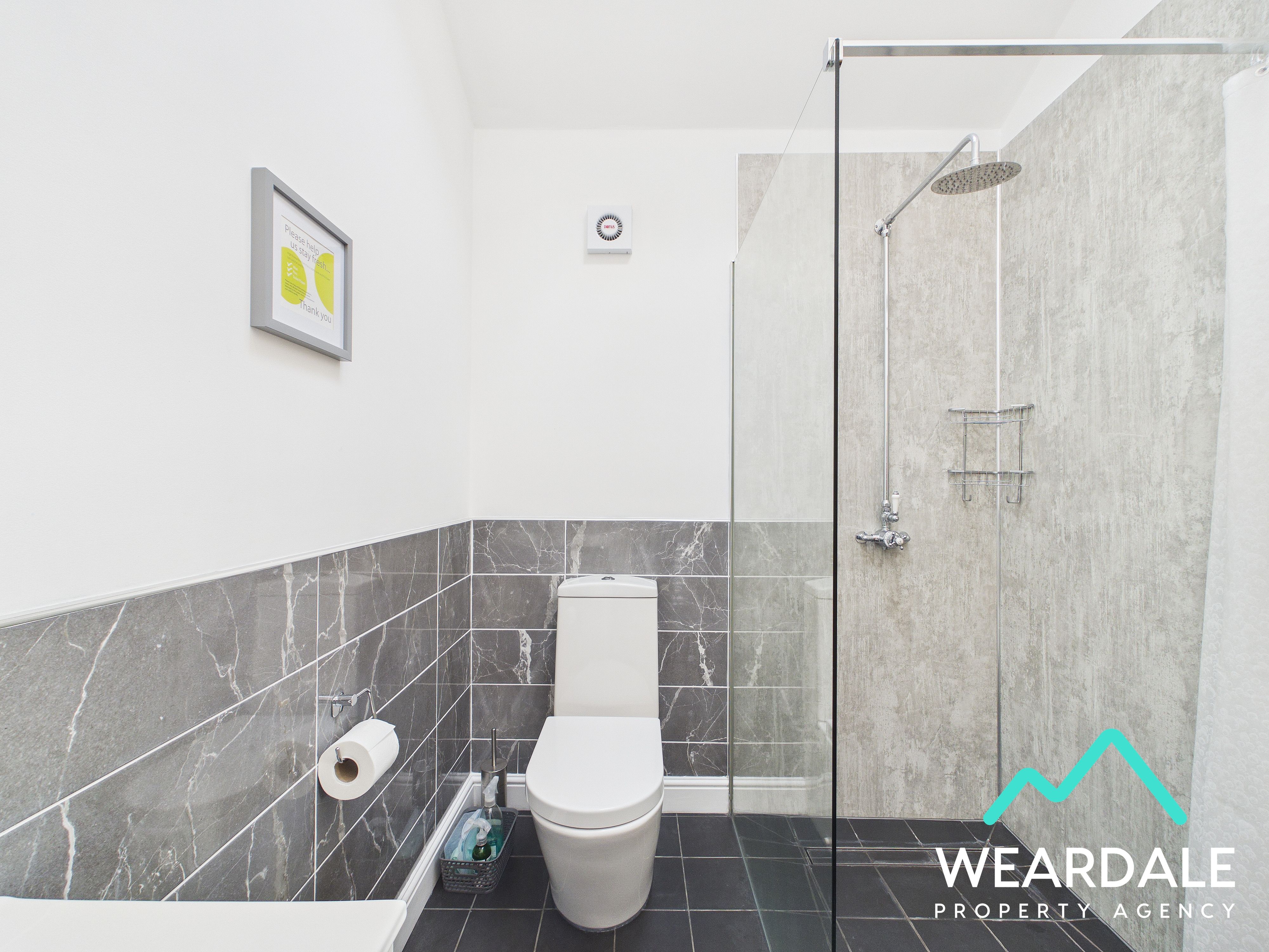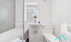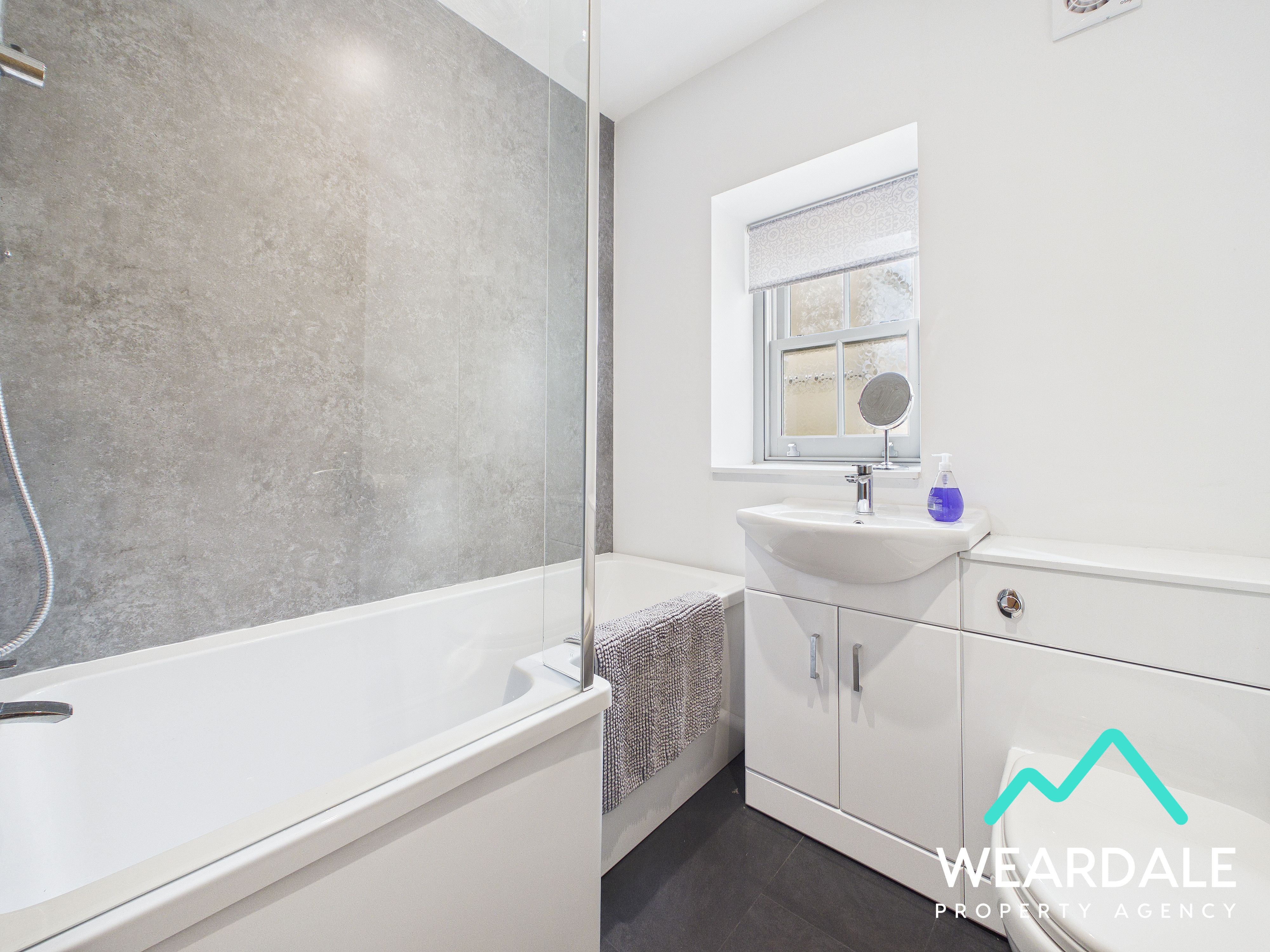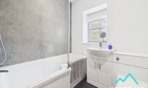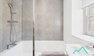 - Accessed from bedroom 2 - Wooden framed double-glazed sliding sash window with frosted panes - Large panel bath benefiting from mains-fed shower above, with rainfall head and acrylic clad enclosure - WC and hand-wash basin, both set within a vanity unit with integrated storage cupboard - Extractor fan - LVT flooring - Vertical heated towel rail - Ceiling spotlights