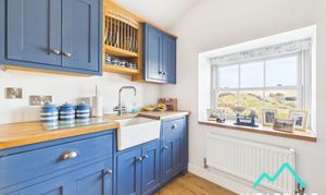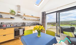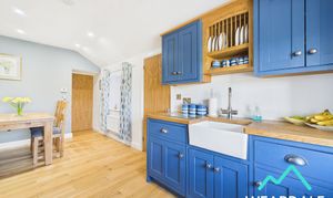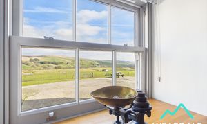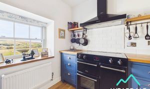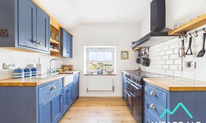 - Positioned centrally within the ground floor, accessed internally from the rear porch and providing onward internal access to the utility room and living room - Wooden framed double-glazed windows to the Western and Northern aspects, with the latter providing fantastic views over the surrounding hillsides - Custom solid wood kitchen with solid oak work surfaces and a range of over/under counter storage units - Electric range cooker with extractor hood above and tiled splashback - Belfast sink - Engineered oak flooring - Two radiators - Ceiling spotlights - Attic hatch to roof space above