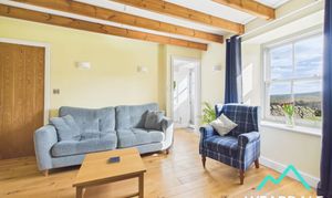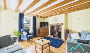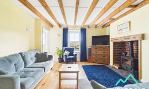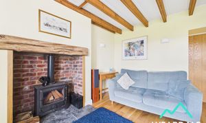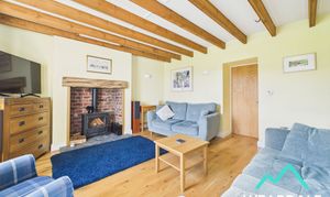 - Positioned to the front of the property and accessed internally from both the kitchen and entrance hallway - Wooden framed double-glazed sliding sash window to the Eastern aspect, with beautiful views over the garden and surrounding hillsides beyond - Multi-fuel burner set on a tiled hearth in brick surround, with wooden mantle above - Exposed wooden ceiling beams - Under stairs storage cupboard which benefits from a light - Engineered oak flooring - Radiator - Wall mounted light fittings