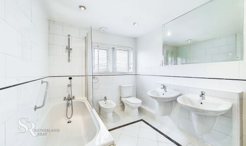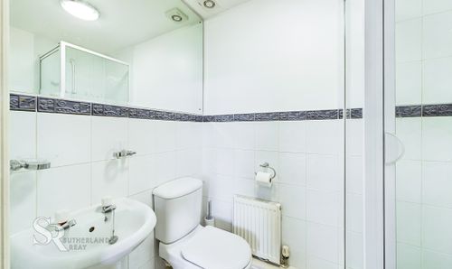 The bathroom floor is tiled, and the rear UPVC windows have privacy glass, Venetian blinds, a shower bath with a glass screen, and a heated towel rail.