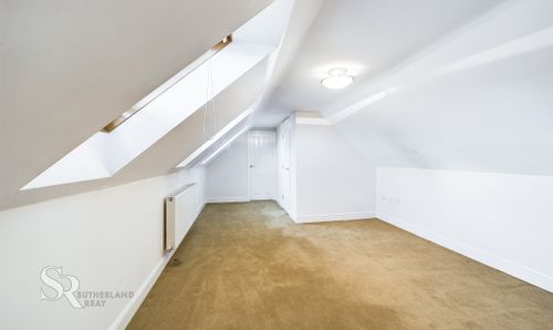 The bedroom features a beautiful vaulted ceiling and is furnished with cosy carpet flooring. Two front-facing UPVC windows with Venetian blinds allow natural light to flow into the room, creating a welcoming atmosphere.