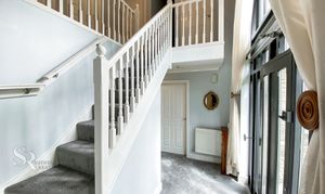 Upon entering the house, you will step onto carpet flooring, which extends to the carpet stairs leading to the first floor. There is an under-stair cupboard and access to the WC. The large arched window is a striking feature that floods the area with natural light. The timber frame adds a touch of style to the space.