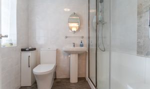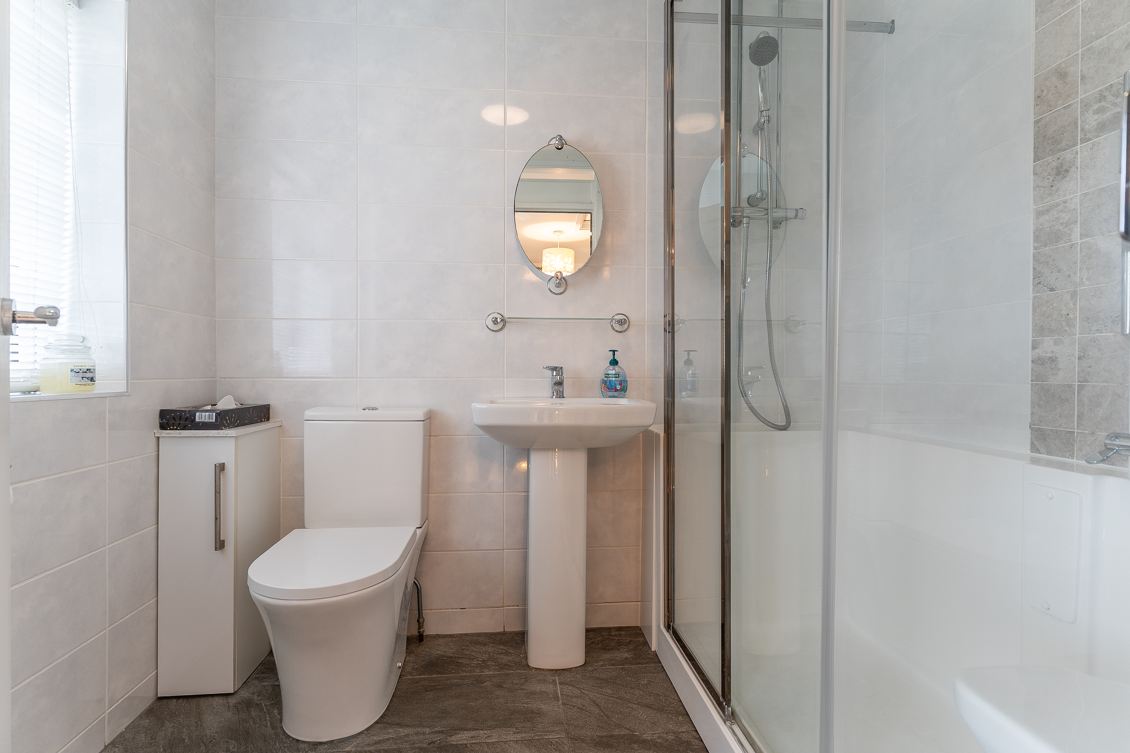 On the first floor, the property offers three well-proportioned bedrooms, each presented to a high standard and offering plenty of natural light. These include two spacious double bedrooms and a comfortable single room, making the layout ideal for families or those requiring a guest room or study. Completing this level is the family bathroom, fitted with a modern suite including a bath, WC, and hand basin.