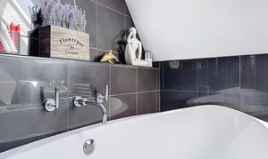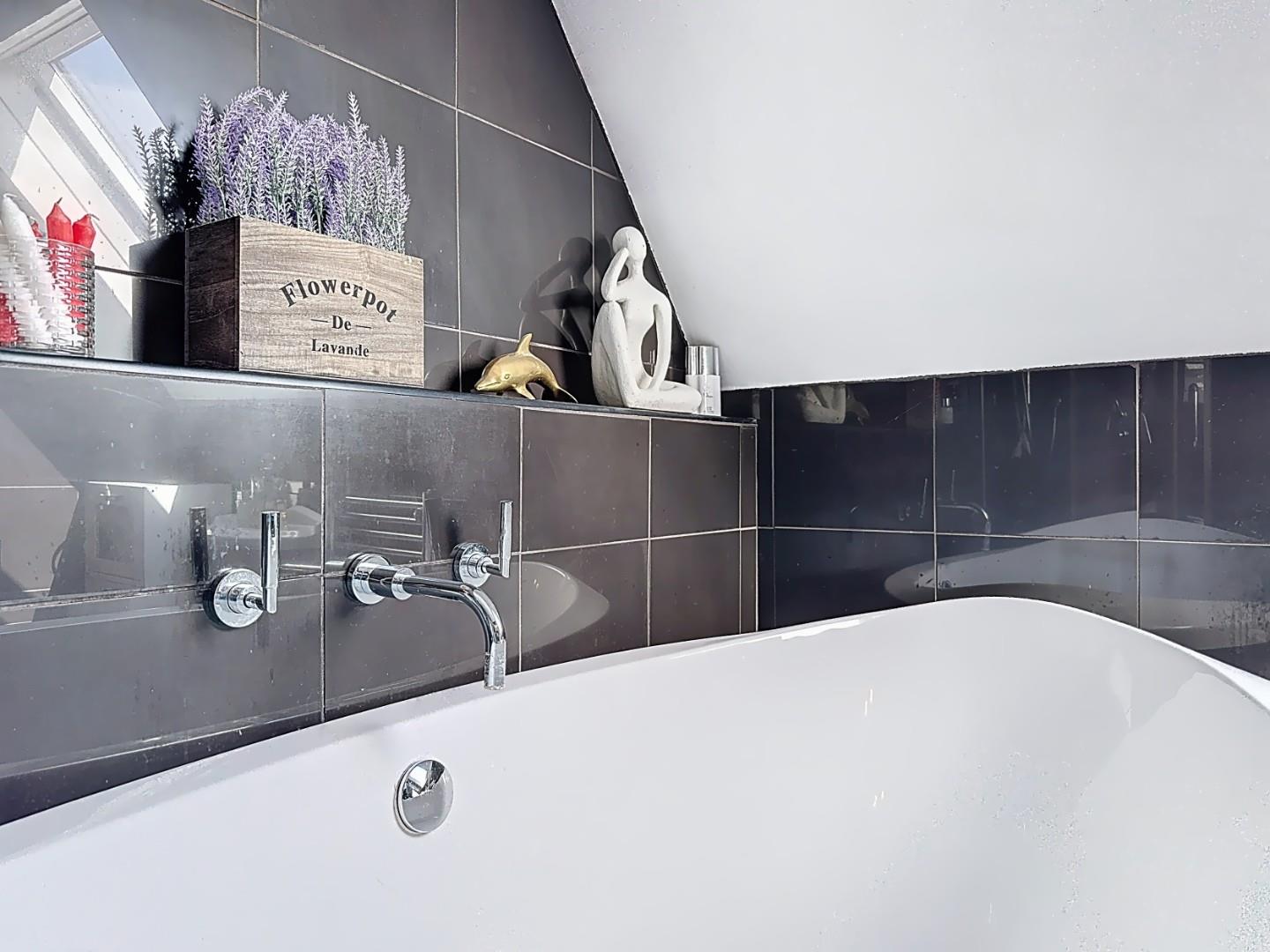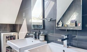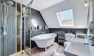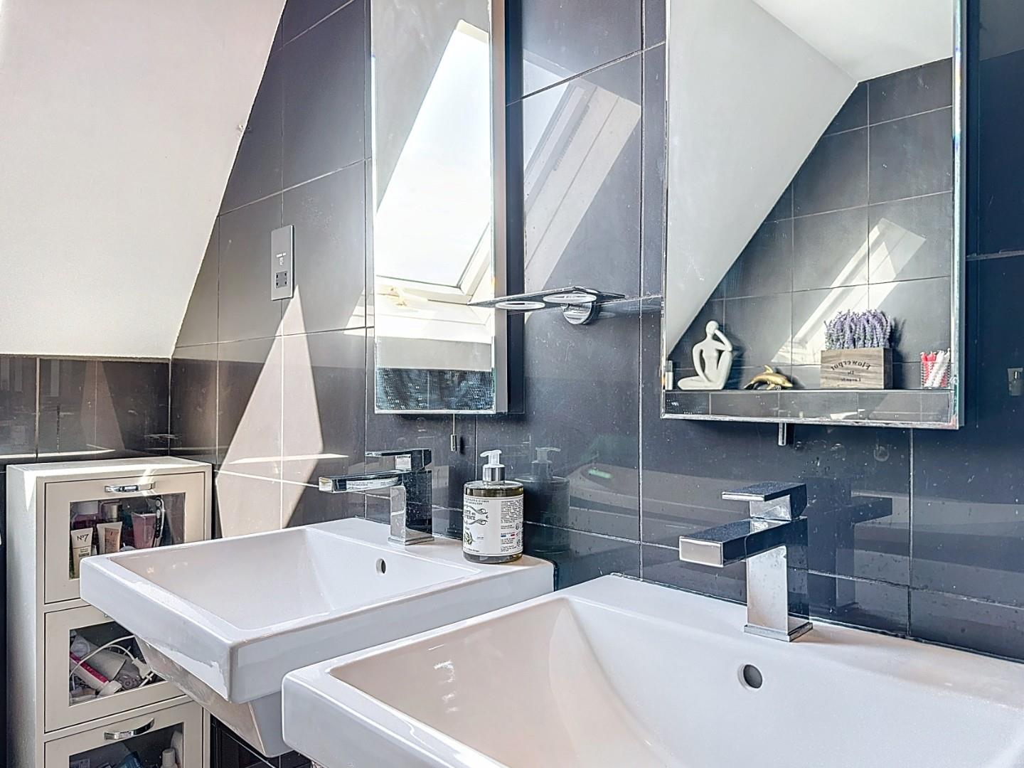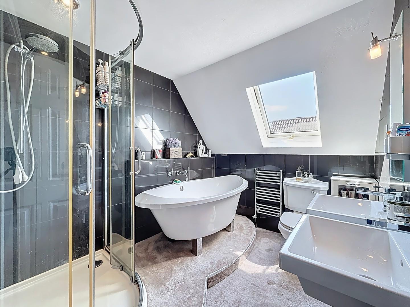 The family bathroom is equally impressive, featuring a freestanding bathtub positioned beneath a skylight, creating a luxurious and relaxing space. It also includes dual sinks and a large walk-in shower.