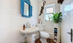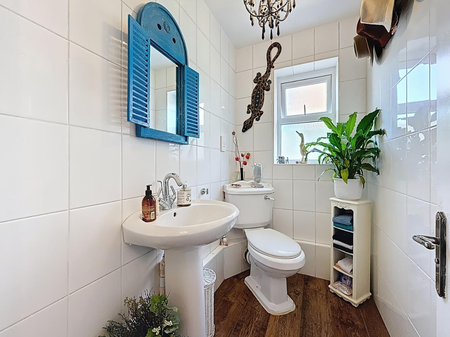 Adjoining the kitchen is a dedicated utility room, complete with matching units, a dark worktop, and space for both a washing machine and tumble dryer. A ground floor WC is conveniently accessed nearby, offering essential practicality for busy family life.