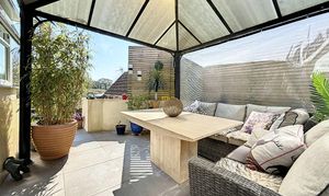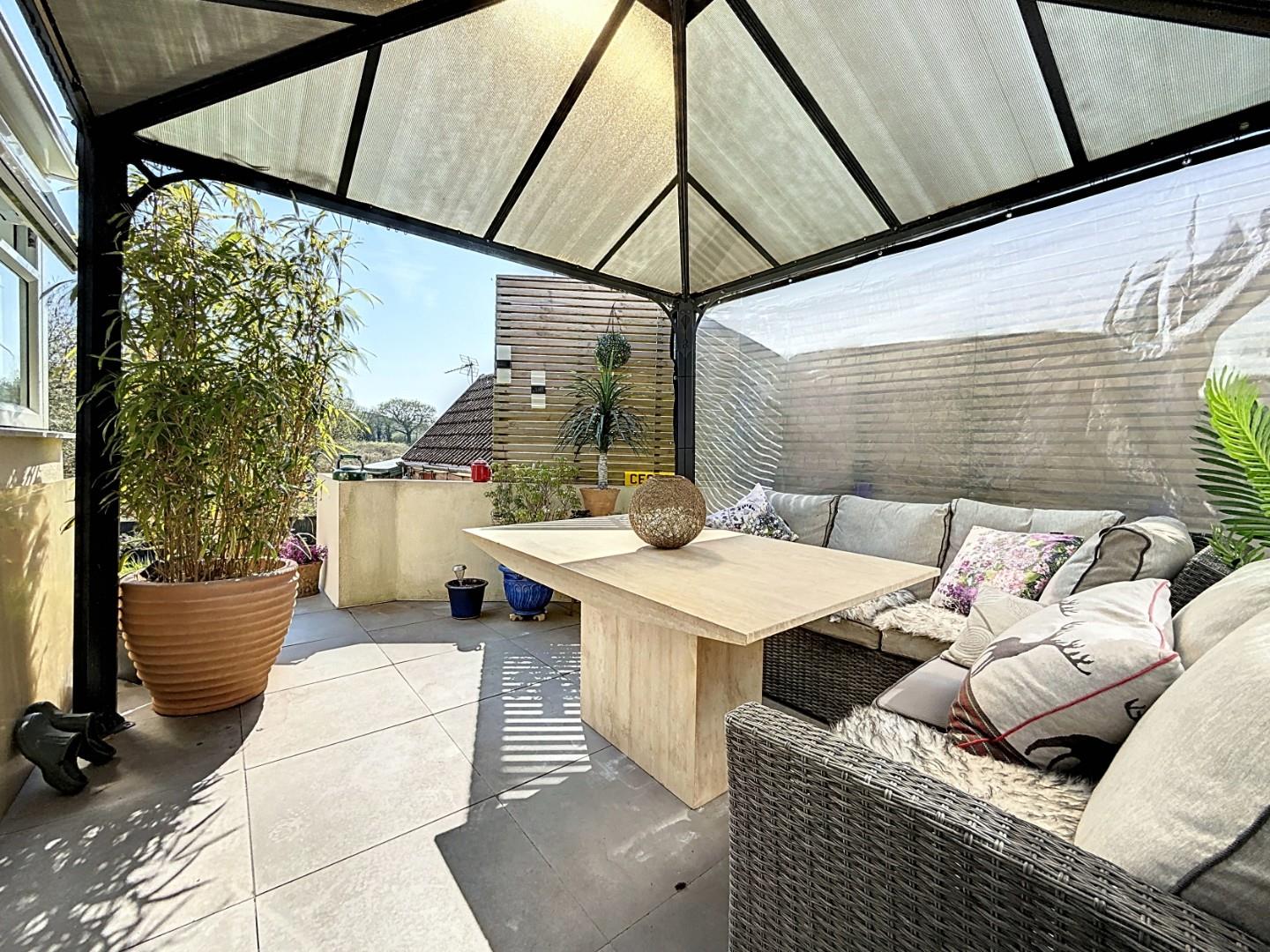 A paved patio area provides the perfect setting for alfresco dining or relaxing with friends, enhanced by a black metal gazebo with a translucent roof and side screening for added privacy and shelter.