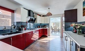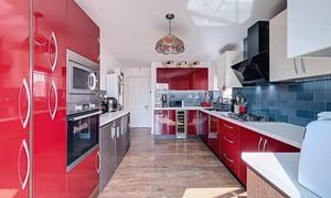 A Kitchen Designed for EntertainingThe kitchen forms a stylish and practical heart of the home, featuring glossy red lower cabinets, contrasting white upper cabinetry, sleek white worktops, and light blue tiled splashbacks. It is well-equipped with integrated appliances, including a dishwasher, electric oven, microwave, and wine chiller, alongside a Belfast-style sink and space for an undercounter fridge and freezer.