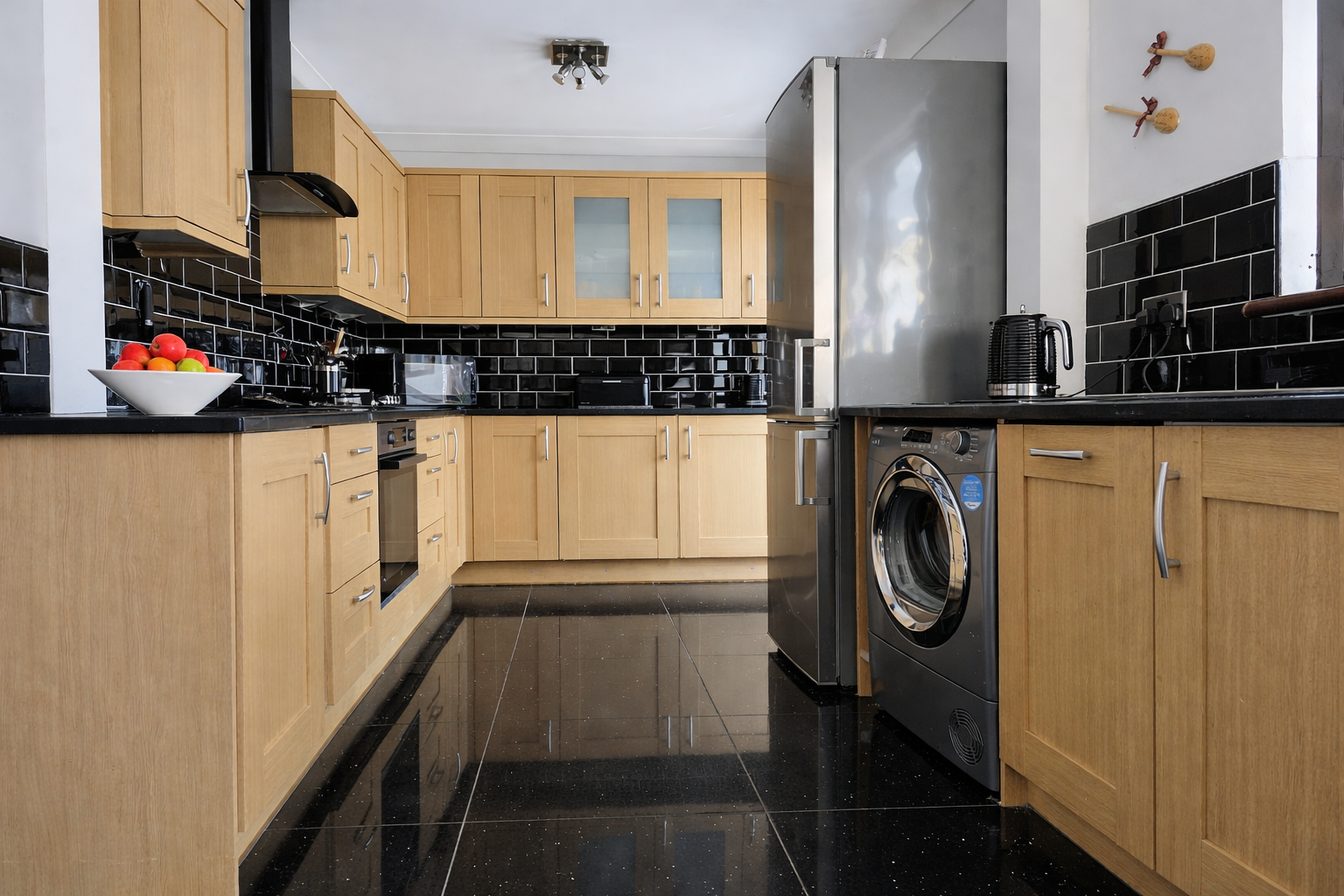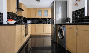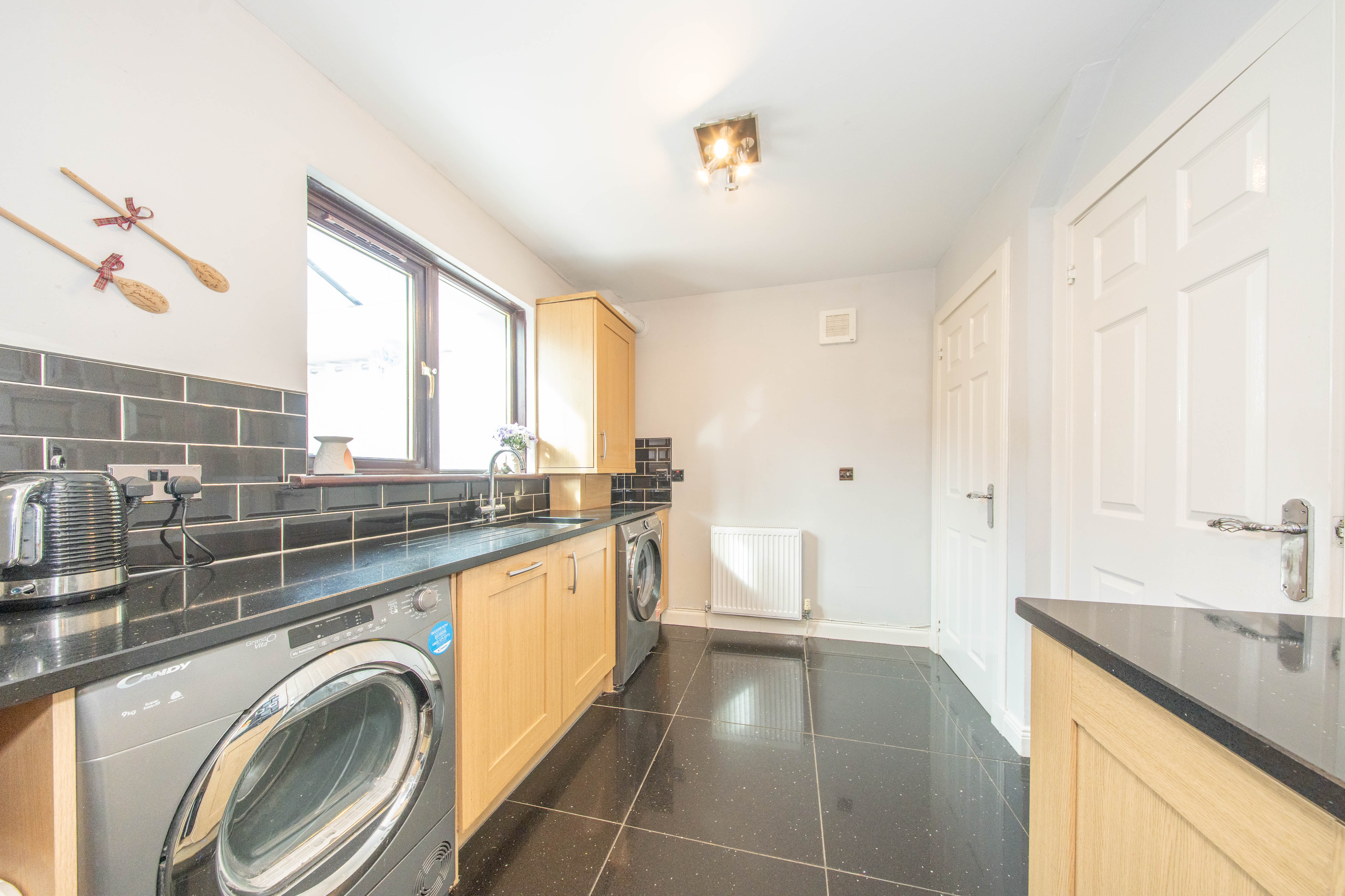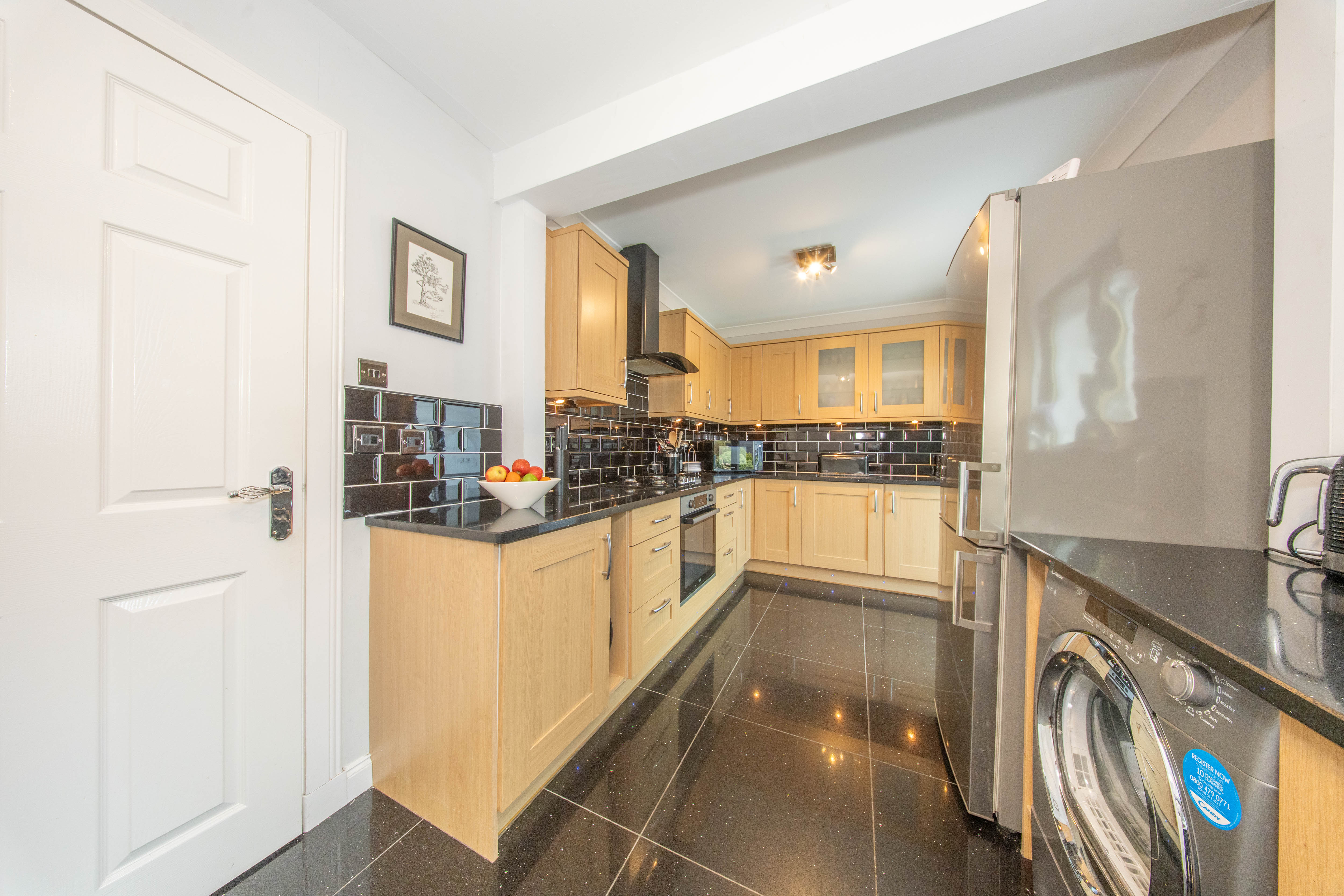 5.36m x 2.34m (17’6” x 7’11”) A modern and well-appointed kitchen fitted with a range of wood-effect wall and base units, complemented by quartz worktops and full-height tiling between the worktops and cabinets, creating a clean and cohesive finish. Integrated appliances include oven, gas hob with extractor hood, integrated undercounter fridge, integrated undercounter freezer and slimline integrated dishwasher. Additional space is provided for a washing machine and tumble dryer. A rear-facing window allows for natural light, while French doors open directly into the sun room, creating a seamless connection between the spaces. A particularly useful feature is the large under-stairs storage cupboard, providing excellent additional storage for household items or pantry use. Further benefits include under-cabinet lighting and plinth-level lighting, enhancing both functionality and atmosphere.