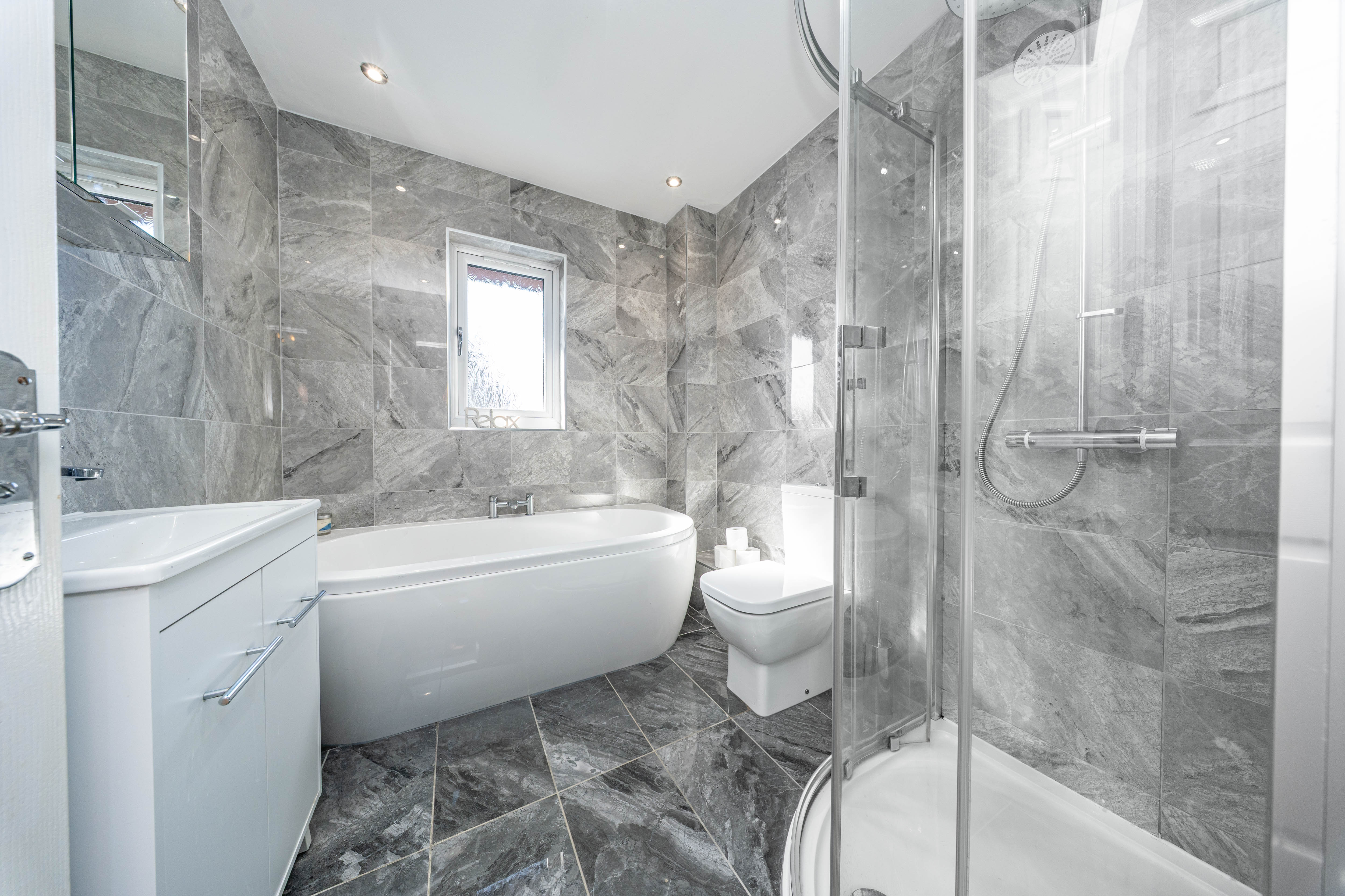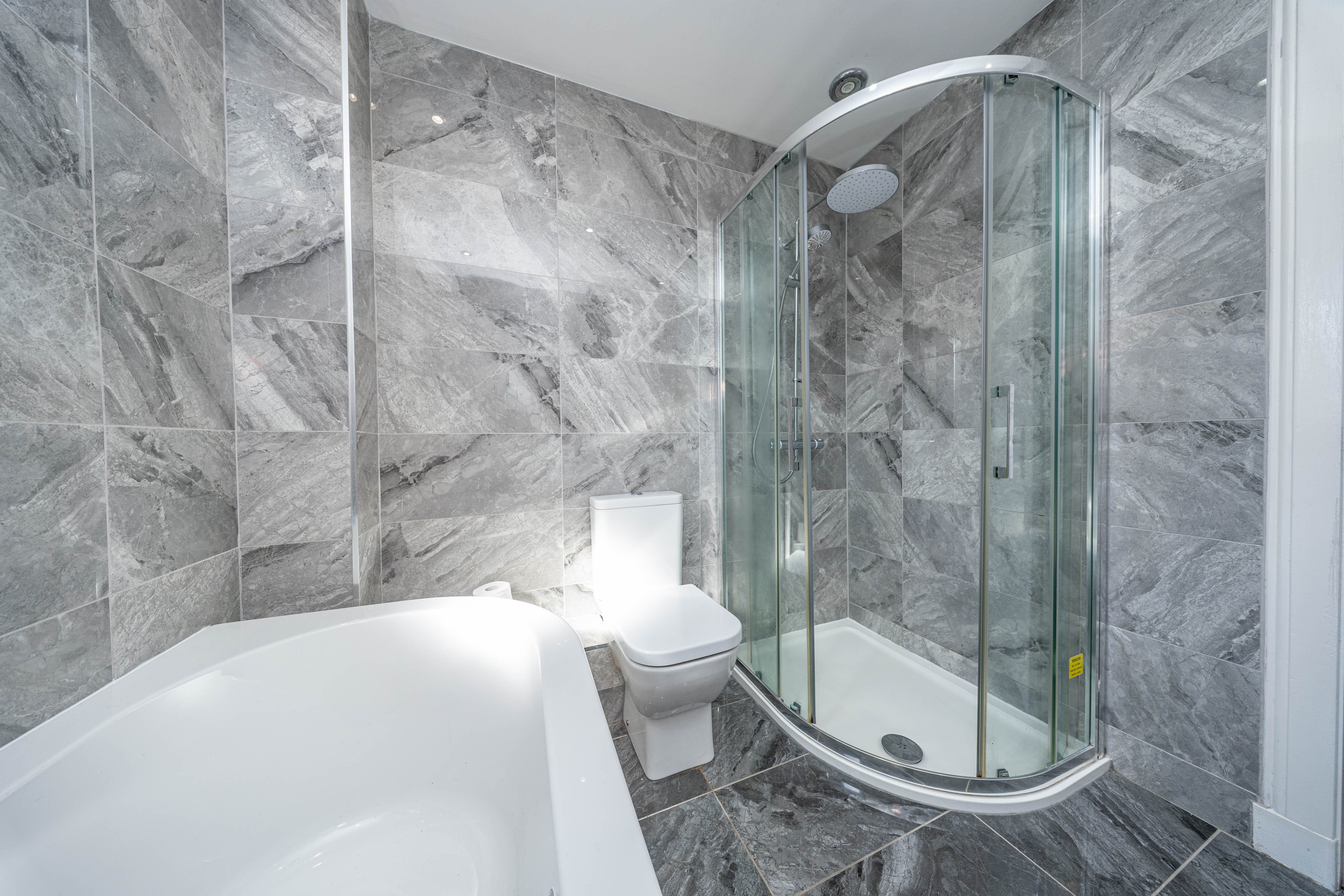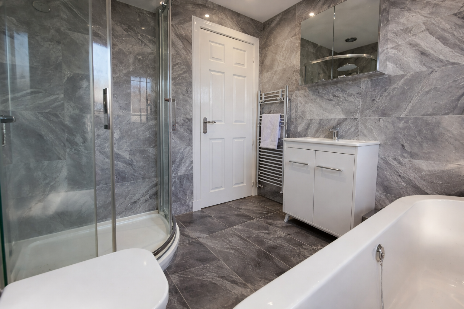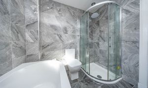 2.18m x 1.98m (7’2” x 6’6”) A contemporary bathroom finished with full-height marble-effect tiling. Comprising a double-ended bath with central taps, separate corner shower with rainfall head and handheld attachment, vanity unit with integrated sink and WC. Additional features include chrome fittings, heated towel radiator and ceiling downlights.