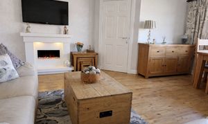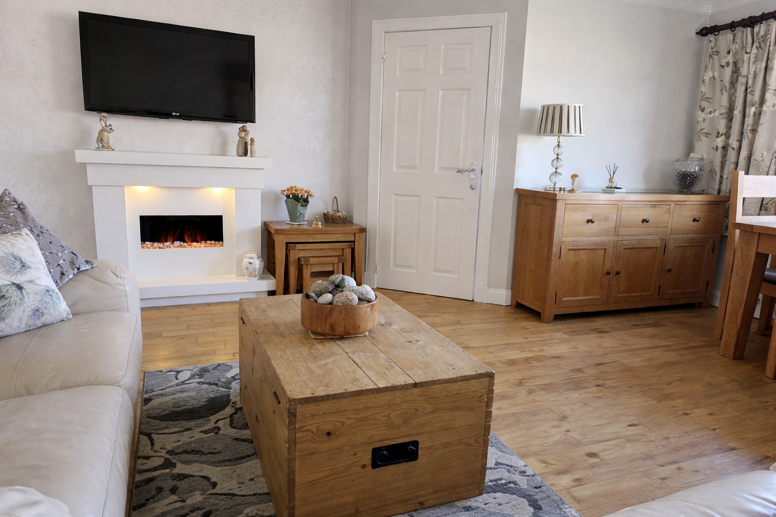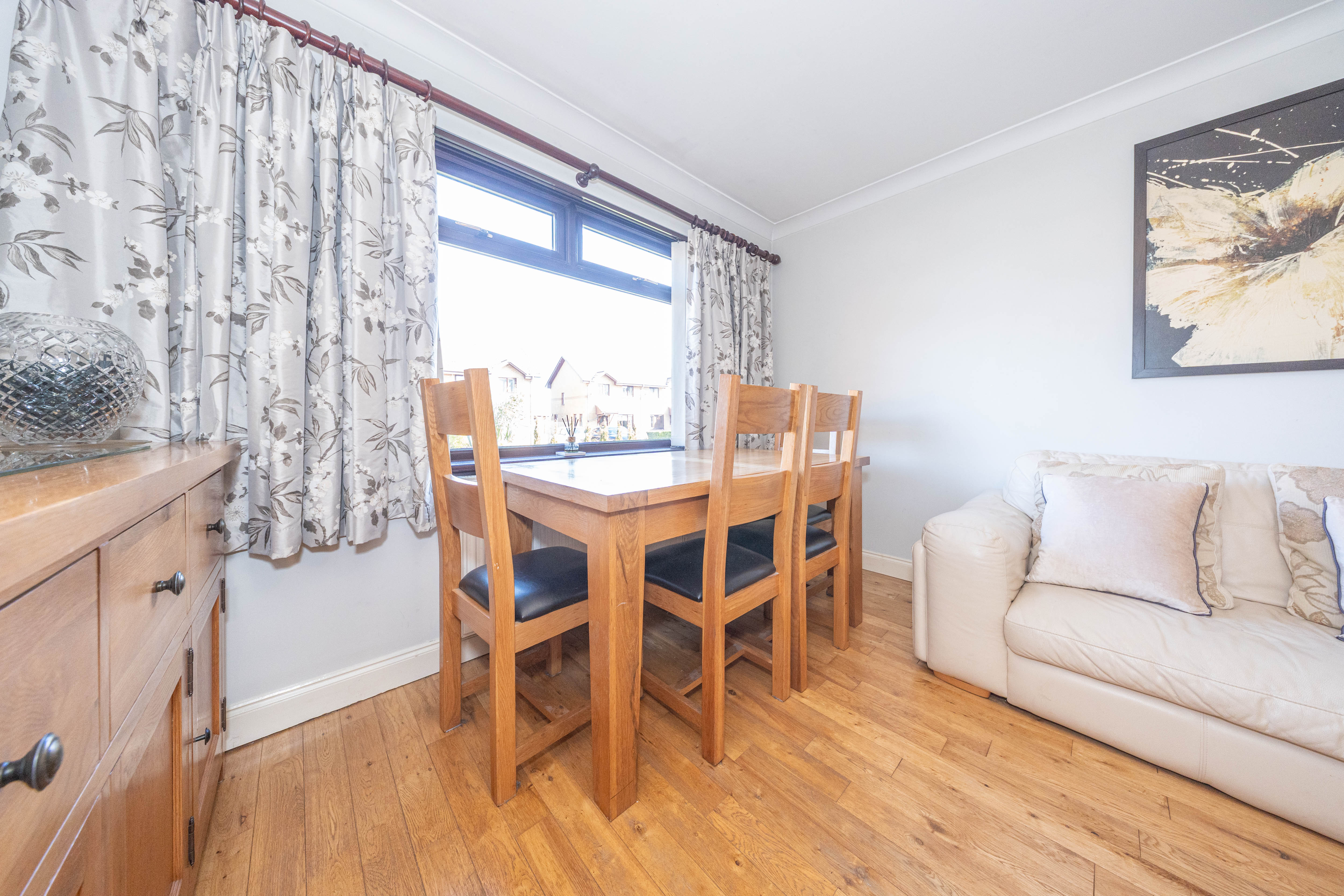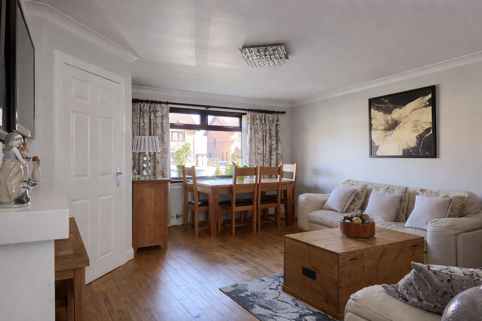 4.97m x 4.35m (16’3” x 14’3”) A spacious and versatile reception room with ample space for both lounge and dining furniture. A large front-facing window fills the room with natural light, while a modern built-in electric fireplace creates an attractive focal point. The wall-mounted television will be included within the sale.
