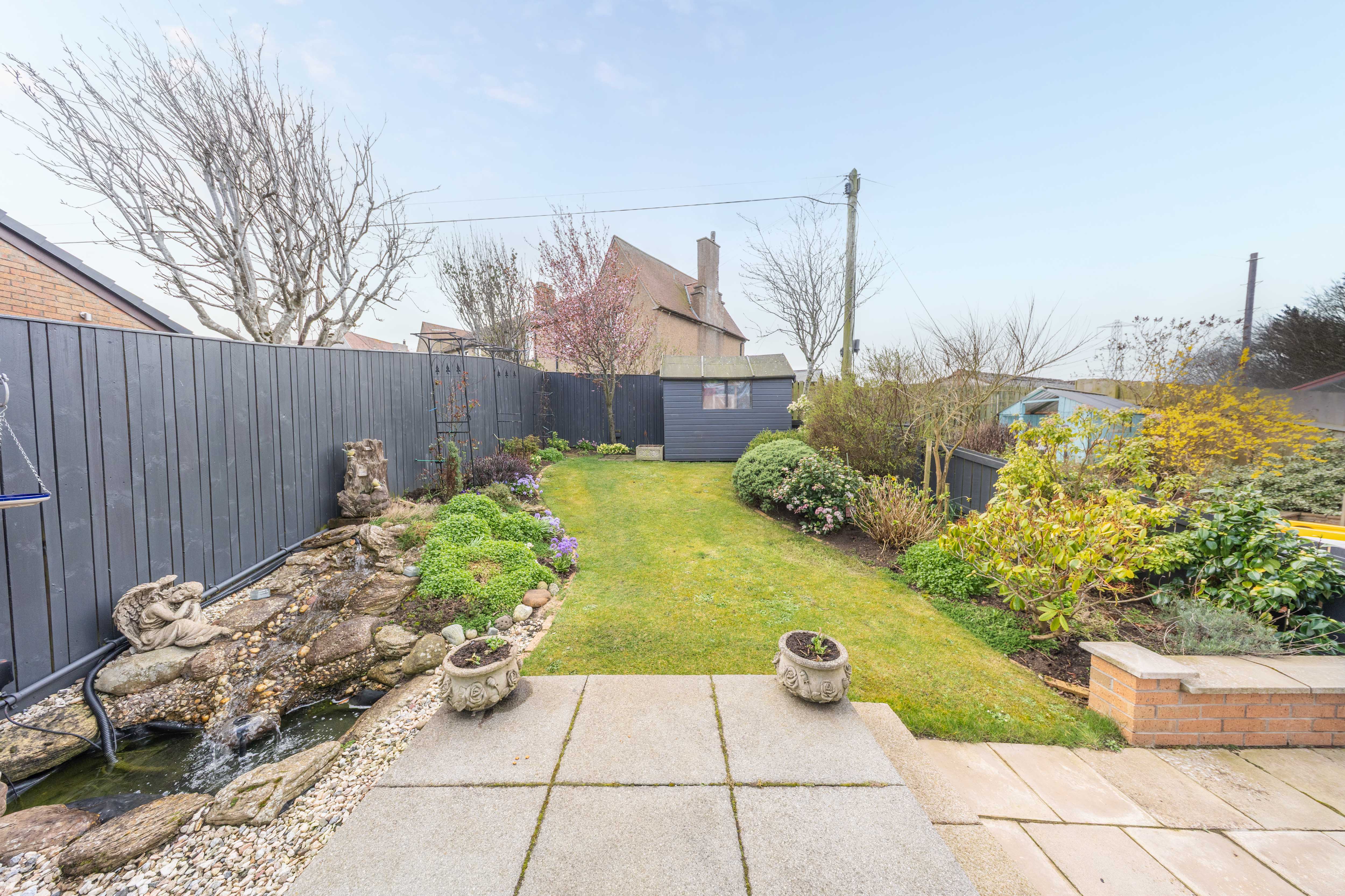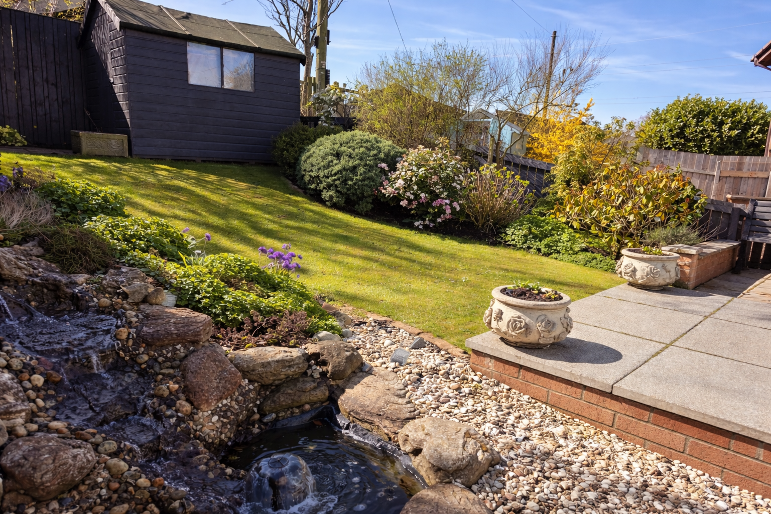 The rear garden is private and enclosed, offering a mix of lawn, mature planting and a patio area directly accessed from the sun room - ideal for outdoor dining and entertaining. A garden shed provides additional practical storage.