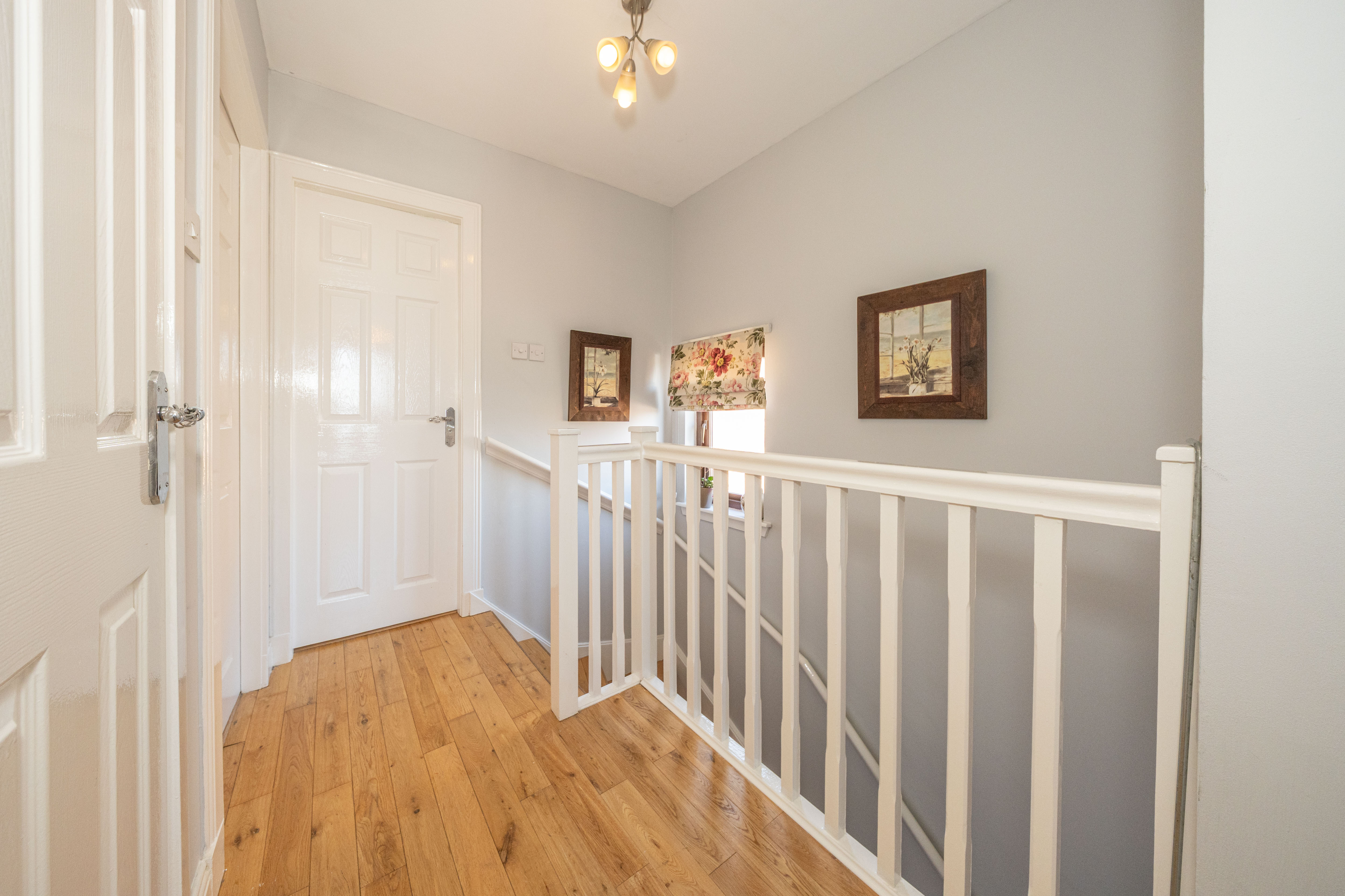 A wooden staircase leads to the upper landing, where real wood flooring continues throughout. The space features painted walls, a ceiling mounted light and a window to the side of the property which allows for plenty of natural light. The landing provides access to all rooms and includes a storage cupboard, smoke detector, attic hatch and radiator.