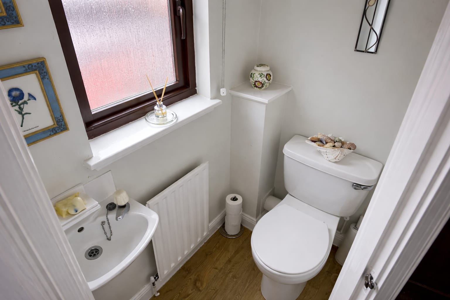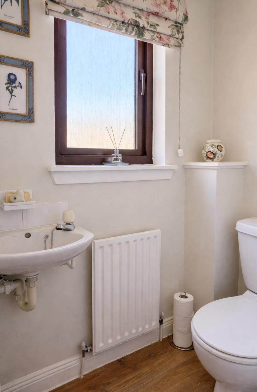 1.41m x 0.88m (4’7” x 2’10”) A well-presented and practical space comprising WC and wall-mounted wash hand basin, finished in neutral décor, with an opaque window providing natural light and privacy.