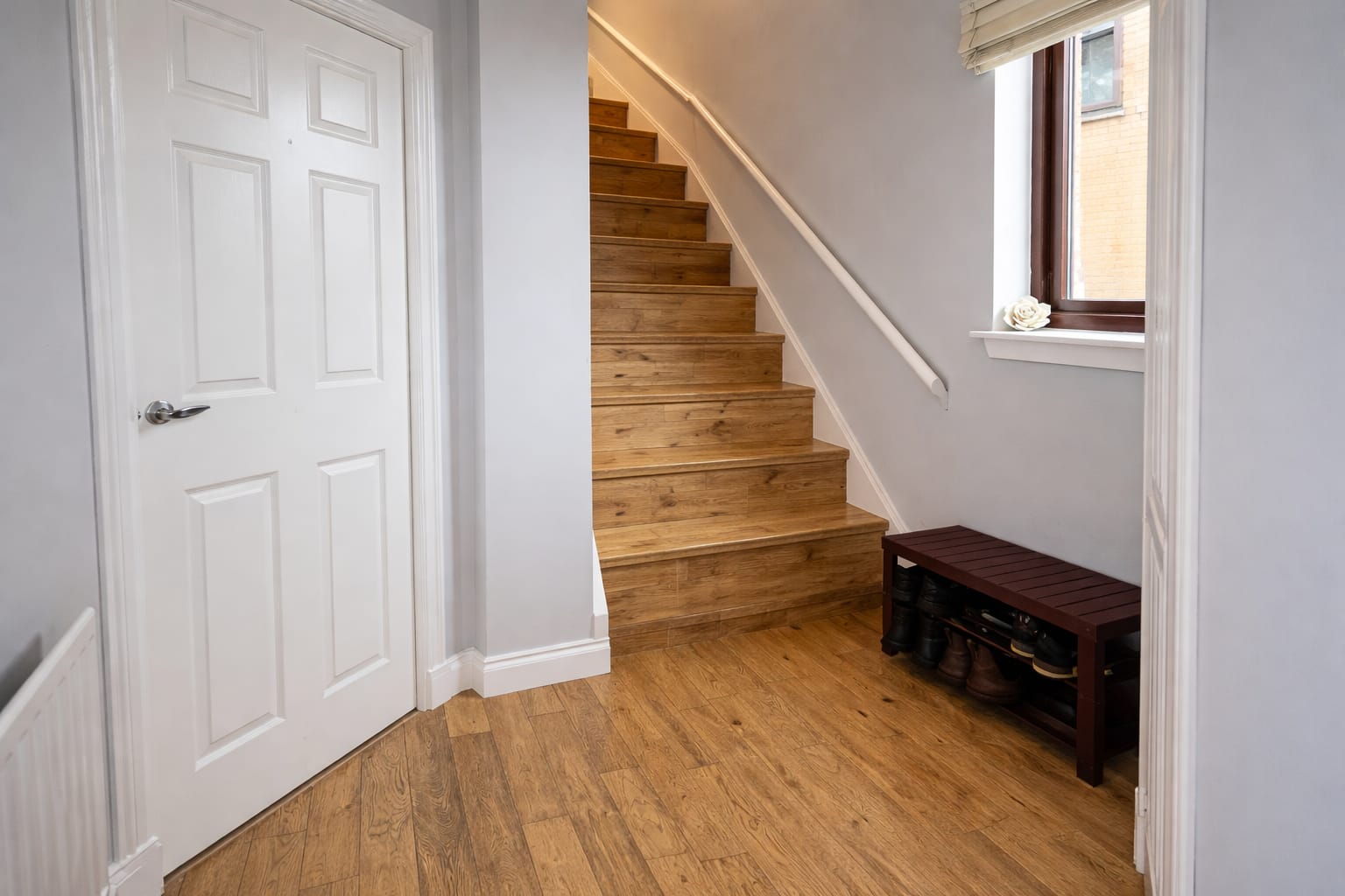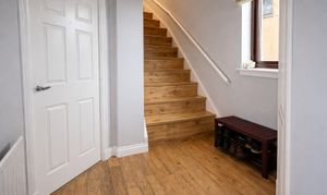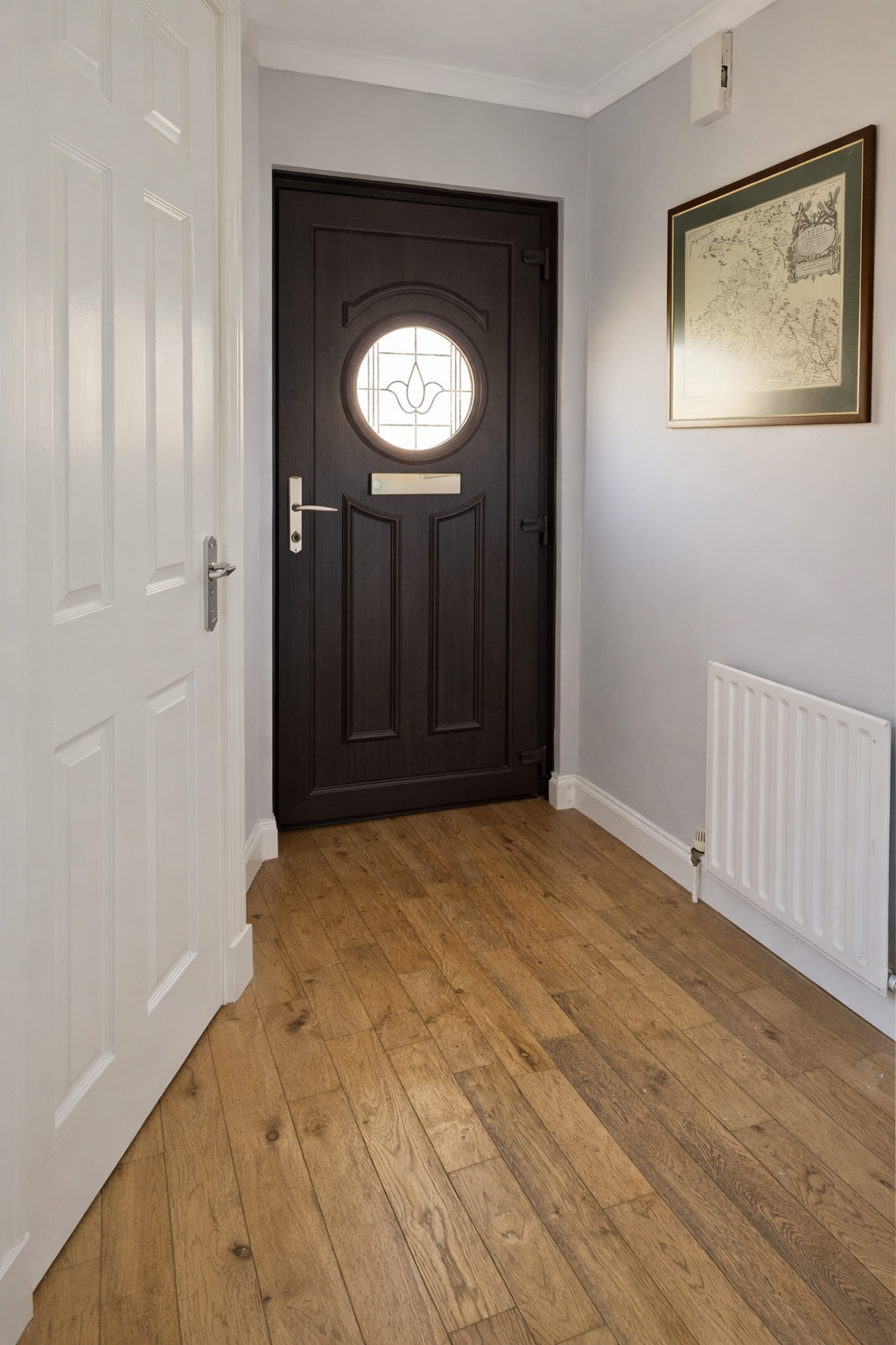 A bright and welcoming entrance space featuring real wood flooring and neutral décor. A decorative glazed front door, complemented by a side window, allows natural light to flow into the hallway. Finished with a radiator, a smoke detector and power points. Please note: the existing hall light fitting will be retained by the seller.