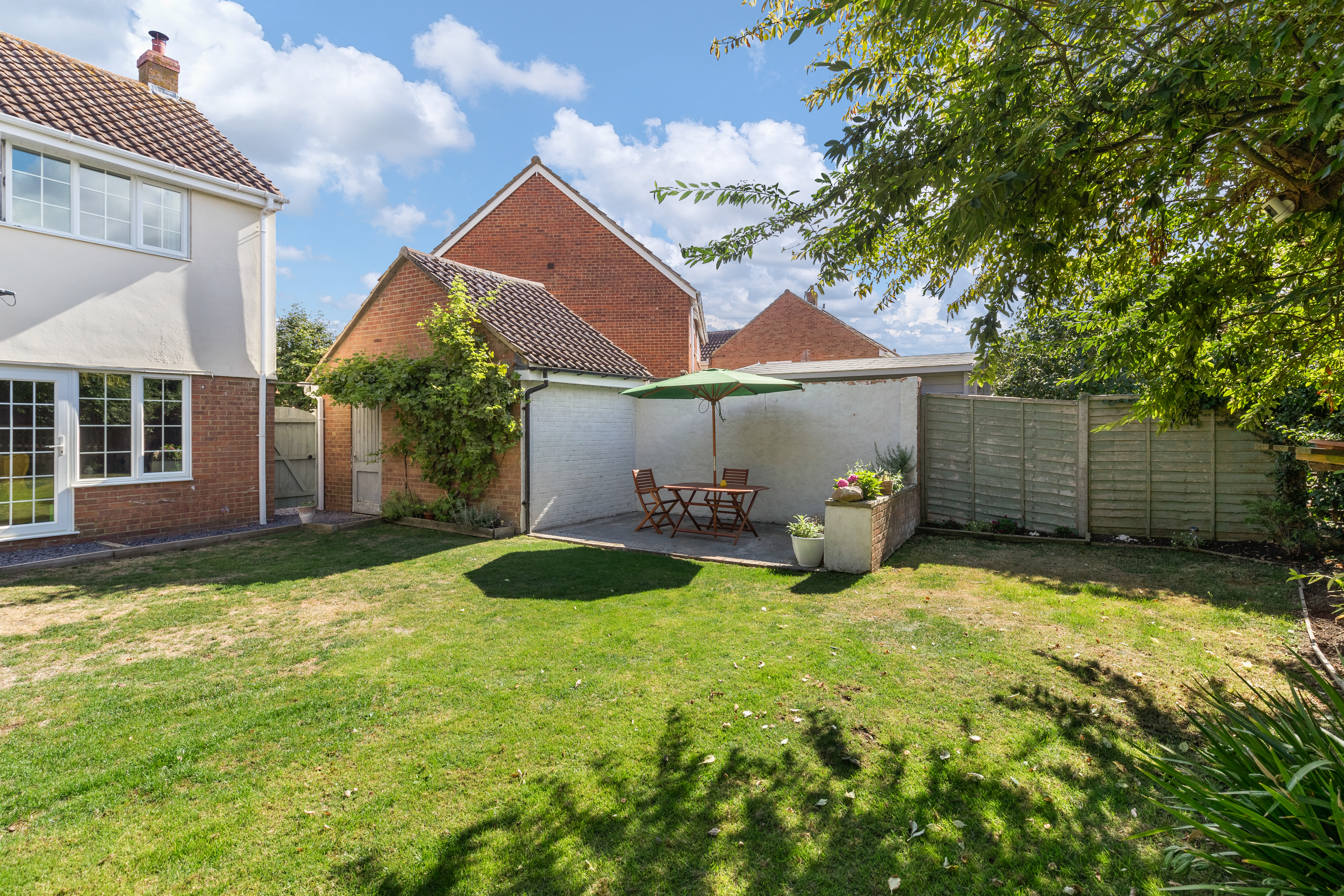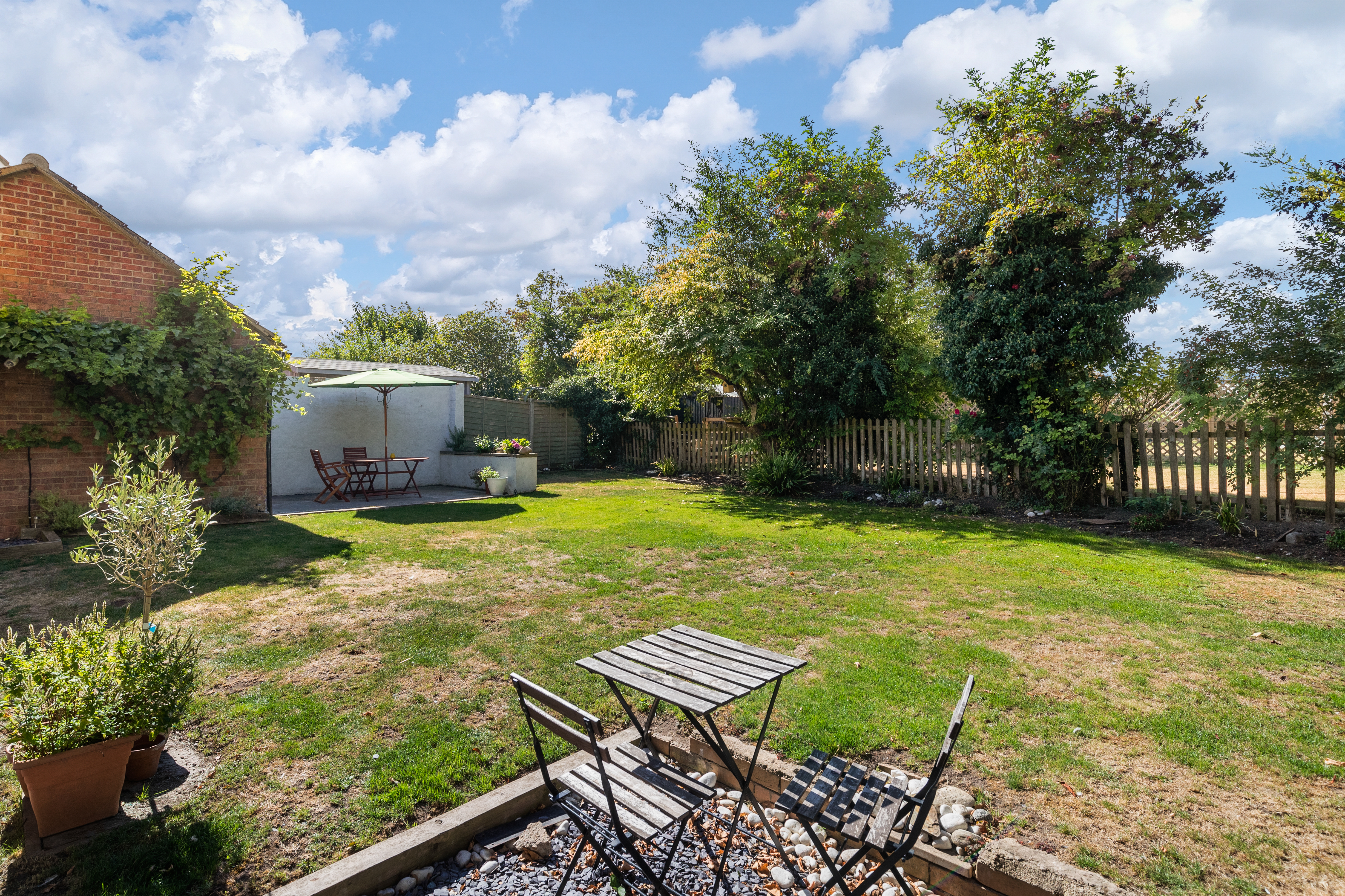 Outside, to the rear, the landscaped garden is an incredibly relaxing and nicely designed area, fully enclosed by fencing and mature trees, and offering excellent privacy. It is laid mainly to lawn with a couple of patio areas, providing both shady and sunny spots to sit and entertain family and friends. There are flower borders, access to the side and to the garage, and lovely countryside views.