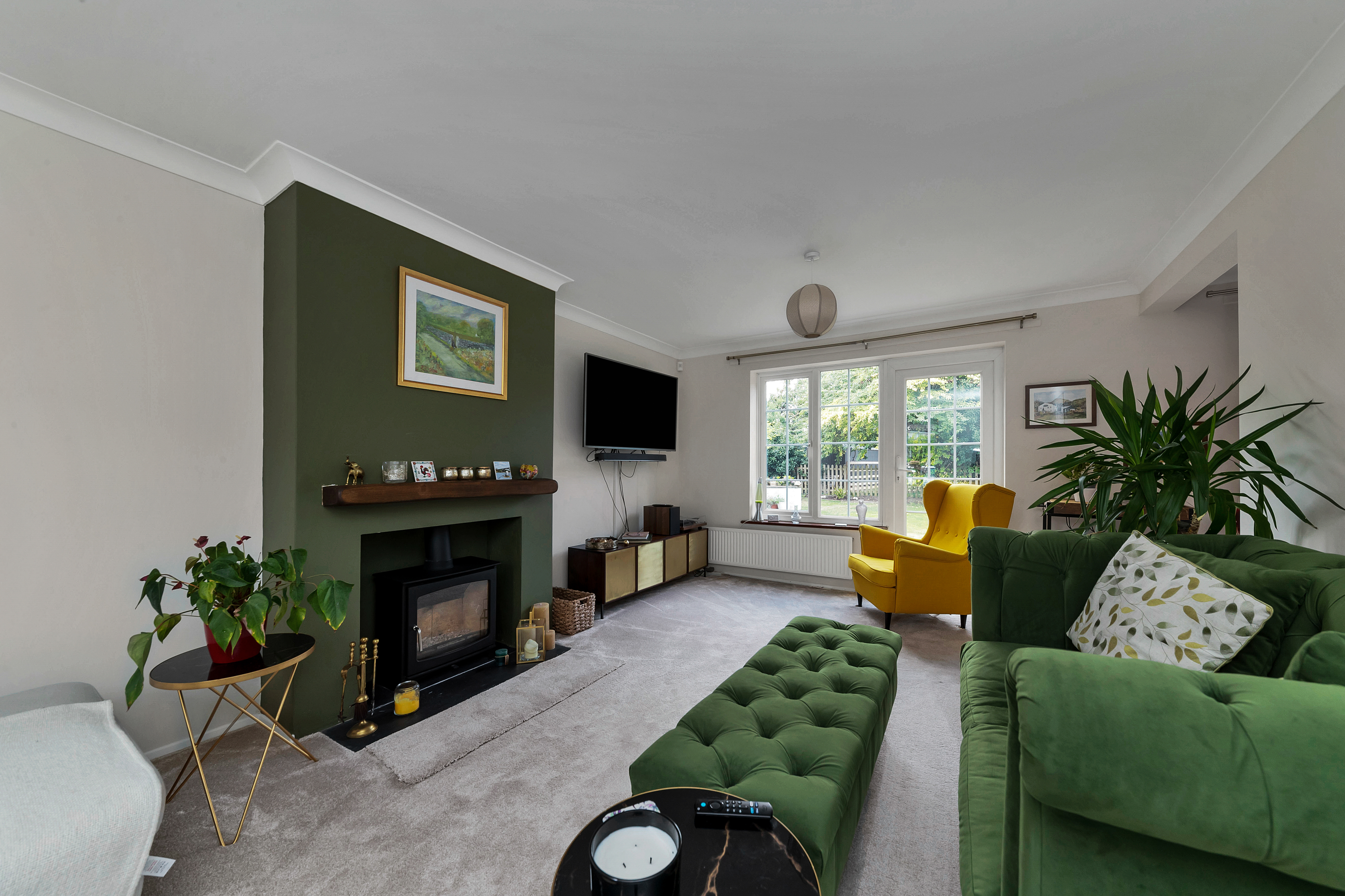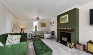 Accessed via an archway, the lounge is an excellent size, benefiting from windows and a door to a dual aspect, beautifully stylish decor, a feature fireplace with a wood-burning stove, plush carpets, pendant lighting, and ample space for a wide variety of lounge and storage furniture.