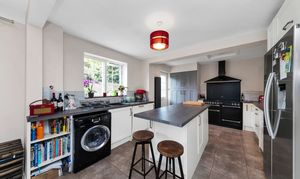 The kitchen/breakfast/dining room is wonderfully open-plan, enjoying windows and doors to a glorious garden aspect, a wide range of modern base and wall units, laminate worktops, a large island with breakfast bar, pendant lighting, tiled walls and splashbacks, a range cooker with extractor hood, integrated seating for a large dining table, an integrated dishwasher, and space for an American fridge/freezer, tumble dryer, washing machine and other kitchen appliances.
