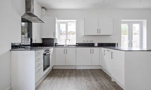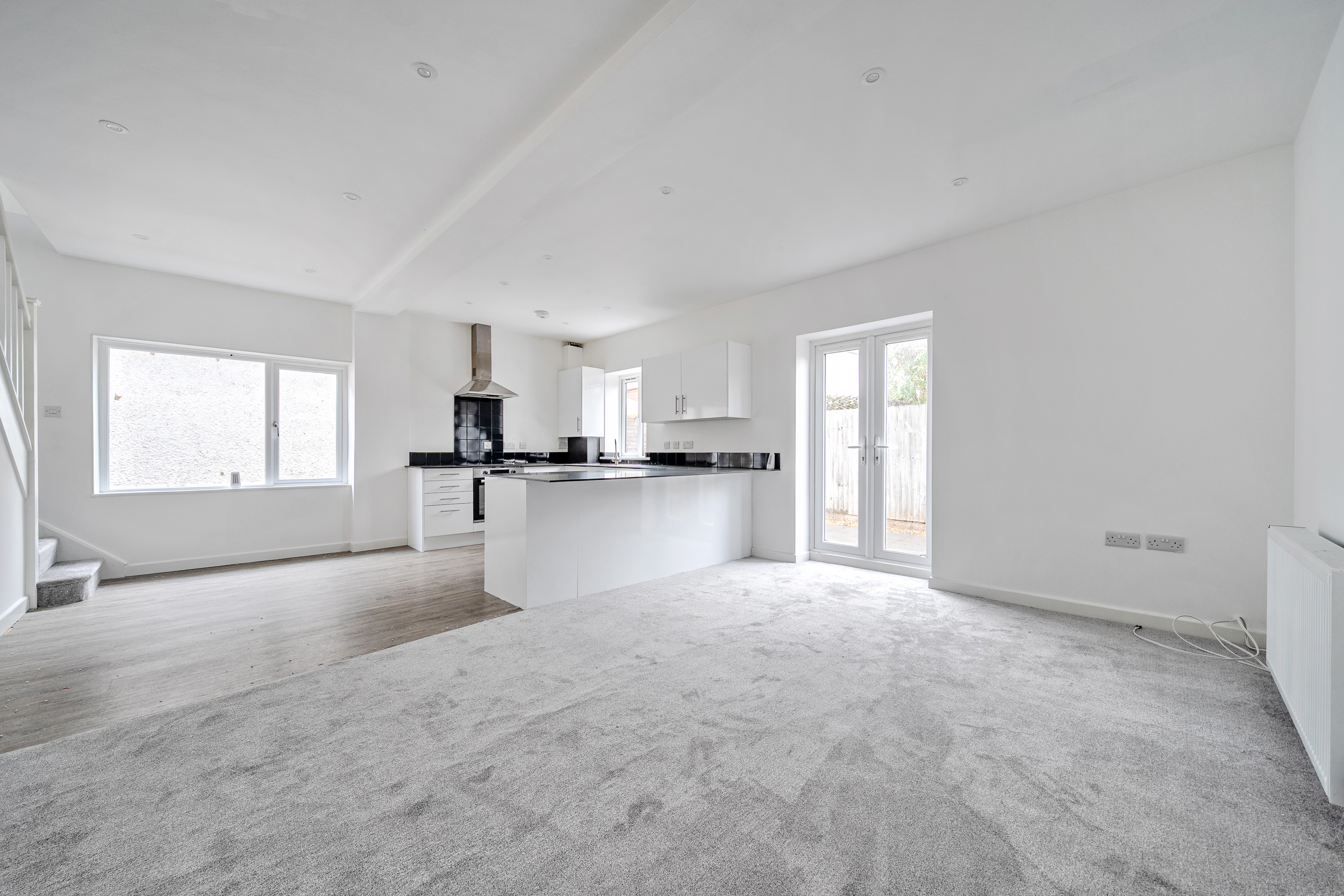 To the rear, the heart of the home is a stunning open-plan kitchen and living area. The kitchen is fitted with modern wall and base units, granite-effect worktops, and integrated appliances including a dishwasher and electric oven. Wood-effect flooring defines the kitchen space, while the living area is carpeted for comfort. French doors open onto the private garden, making it easy to enjoy summer evenings, weekend BBQs, or a quiet morning coffee outdoors.