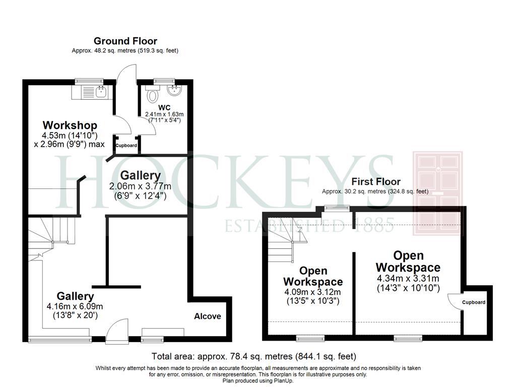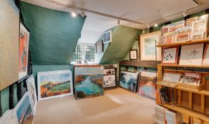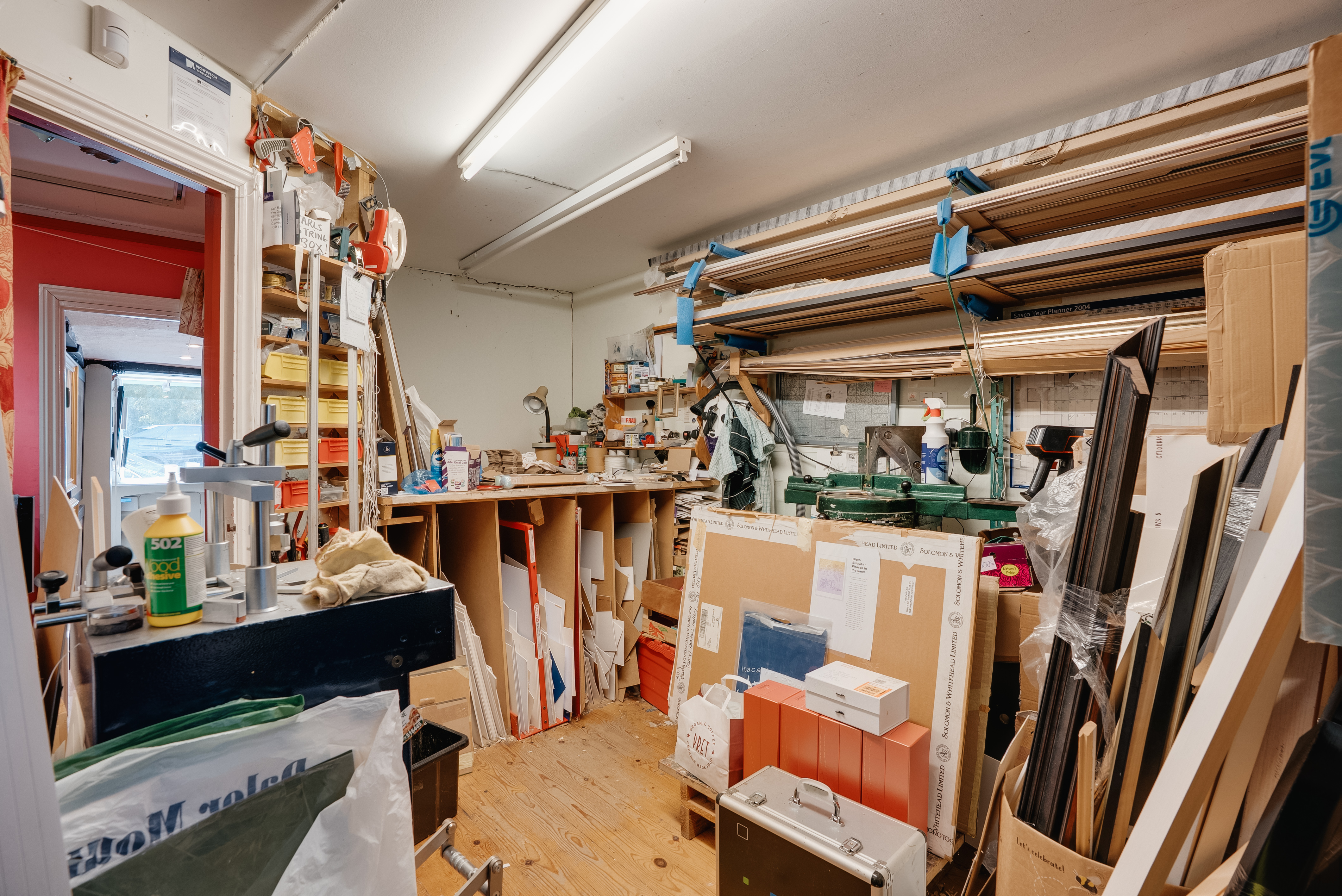 Inside, the ground floor extends to approximately 519 sq ft and opens into a bright, welcoming gallery space with wooden floors, original architectural details, and excellent display potential. Beyond this lies another gallery space, which is currently being used as a store room, ideal for stock, equipment, or back-office use. Completing the ground floor, a versatile workshop area offers direct access to a WC, an additional storage cupboard, and an outside courtyard area, which includes a large shed.