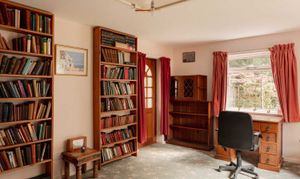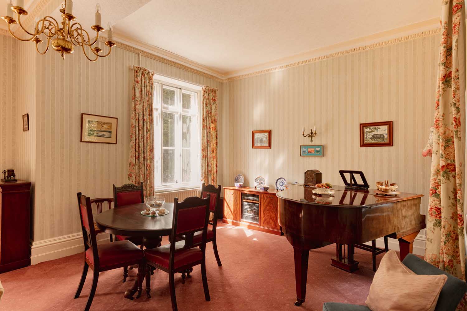 Practicality is enhanced by the more recent addition to the Eastern gable, where a WC sits alongside a dedicated office. Nearby, the garden room provides a light-filled space with direct views of the grounds offering an informal counterpart to the more formal reception spaces. Together, these rooms highlight the depth and versatility of the accommodation, combining historic character with clear potential to be reimagined for modern family living.