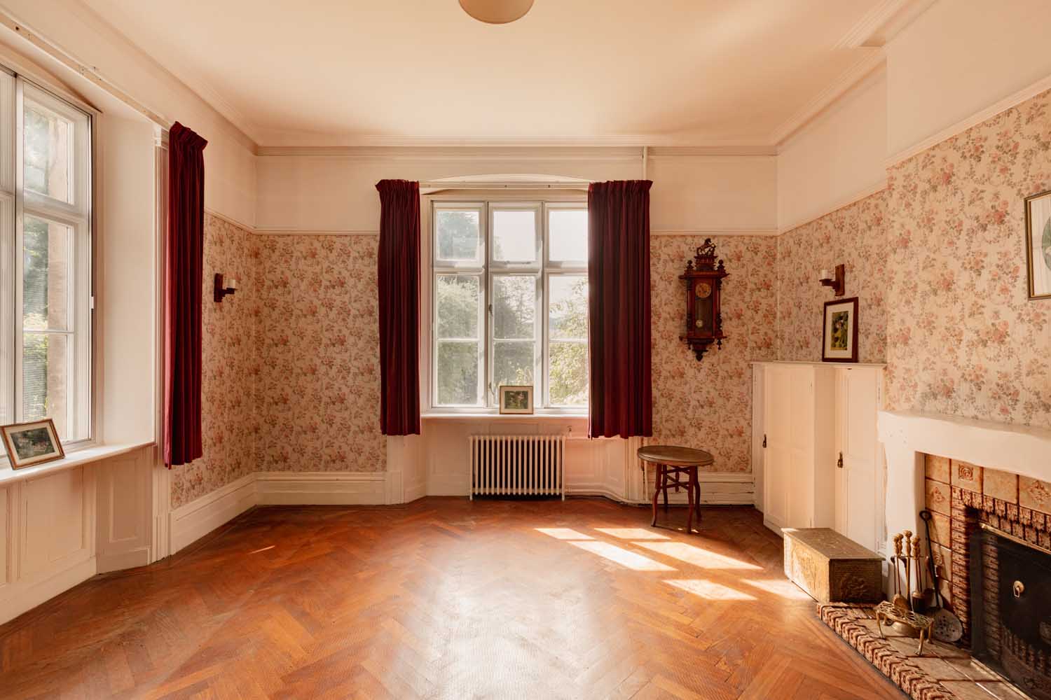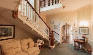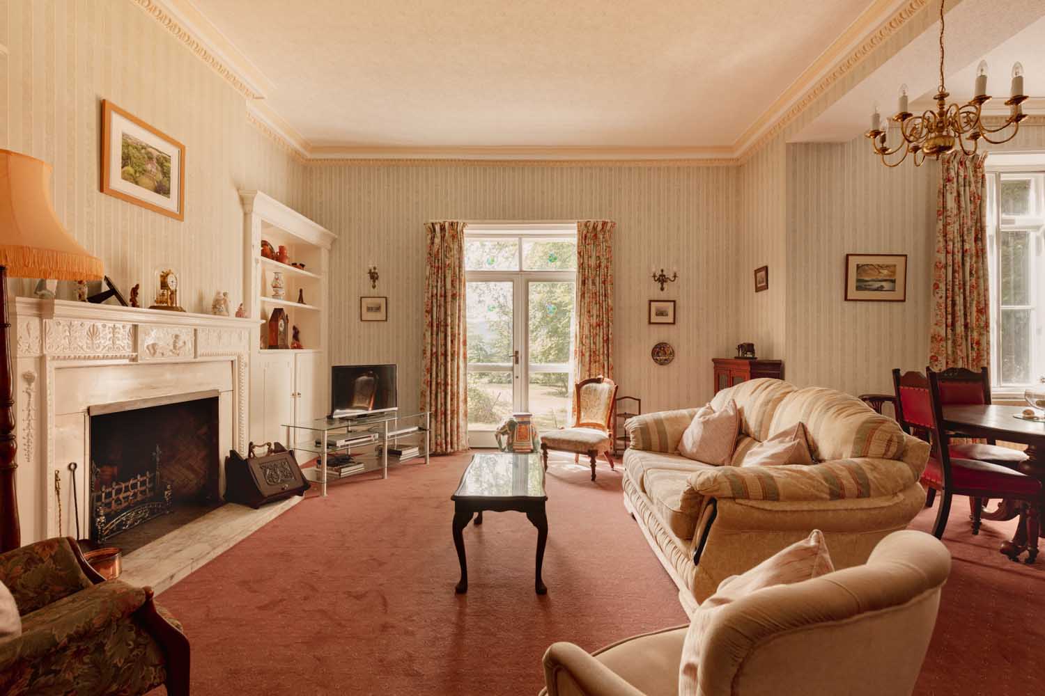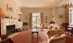 Inside, the layout reflects the ambition of the house. The central reception hall is distinguished by its carved staircase and decorative archways, setting the tone for the accommodation beyond. A series of reception rooms unfolds with generosity, each defined by high ceilings, large windows and period fireplaces. These include a drawing room of excellent proportions, a dining room arranged for formal gatherings, and additional sitting and garden rooms that lend themselves to more relaxed family use. Together, they create a versatile suite of spaces for entertaining and daily living.