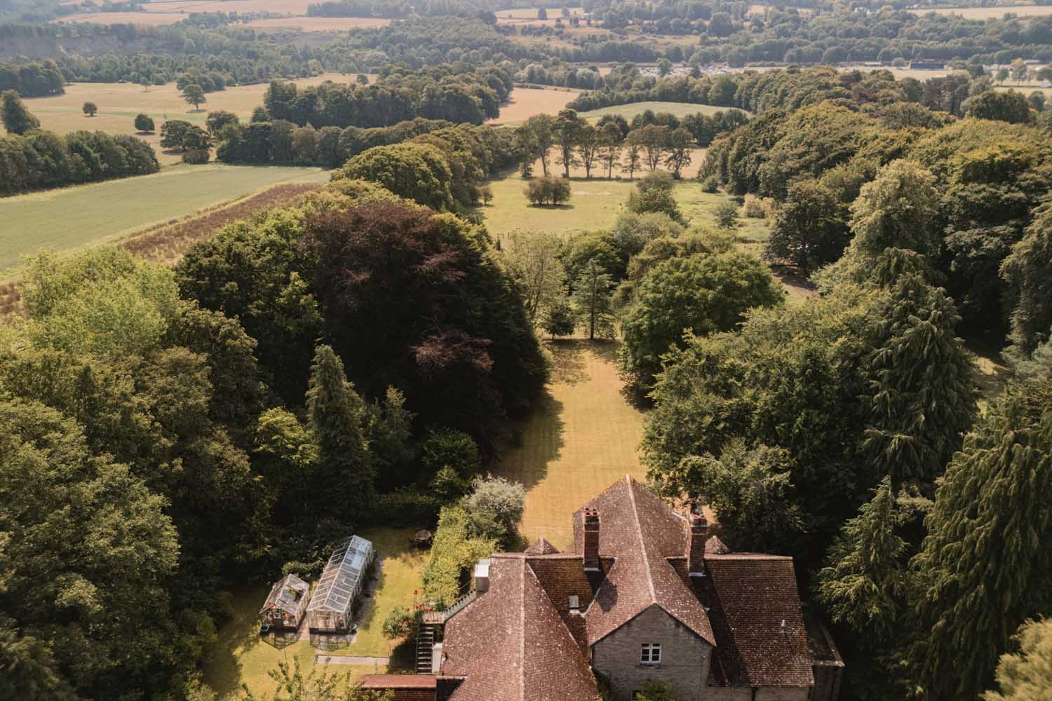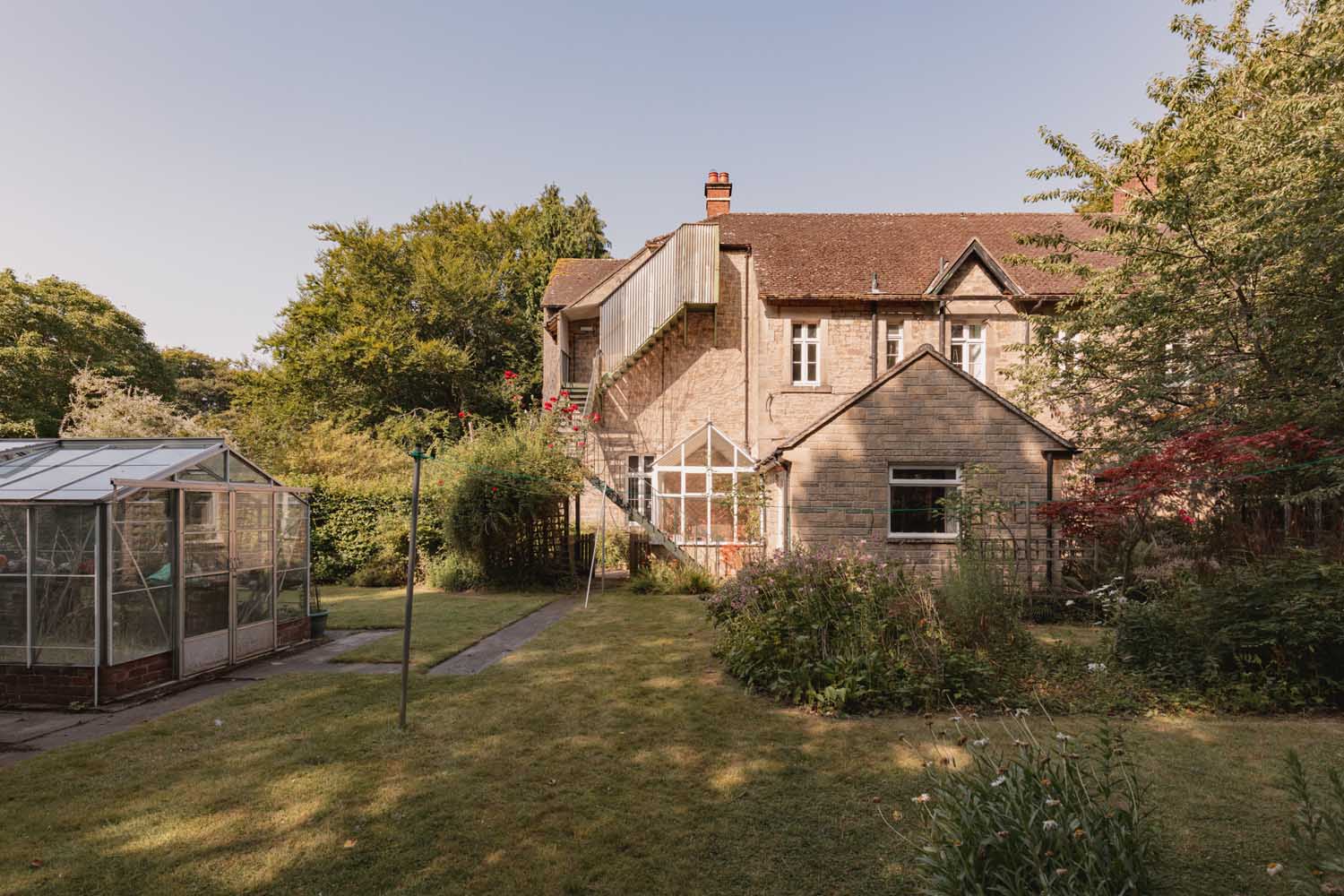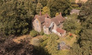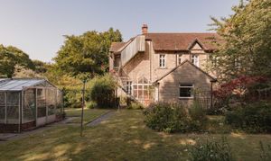 Approached by a private gated drive, the house reveals itself gradually, framed by established trees and opening onto sweeping south-facing lawns. The elevations are handsome and well-proportioned, with tall sash windows and gabled rooflines softened by climbing plants, while a decorative timber porch provides a charming point of arrival.
