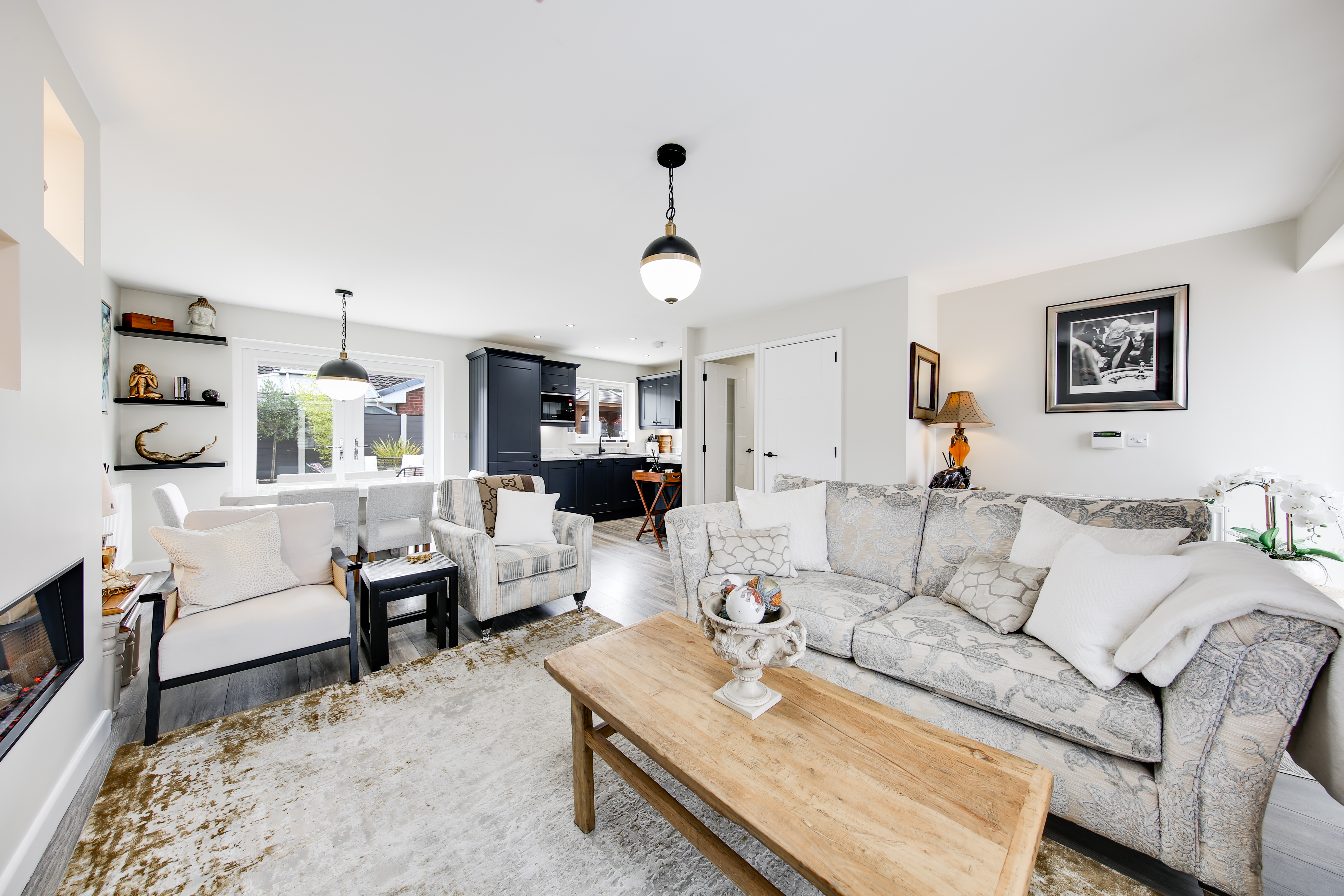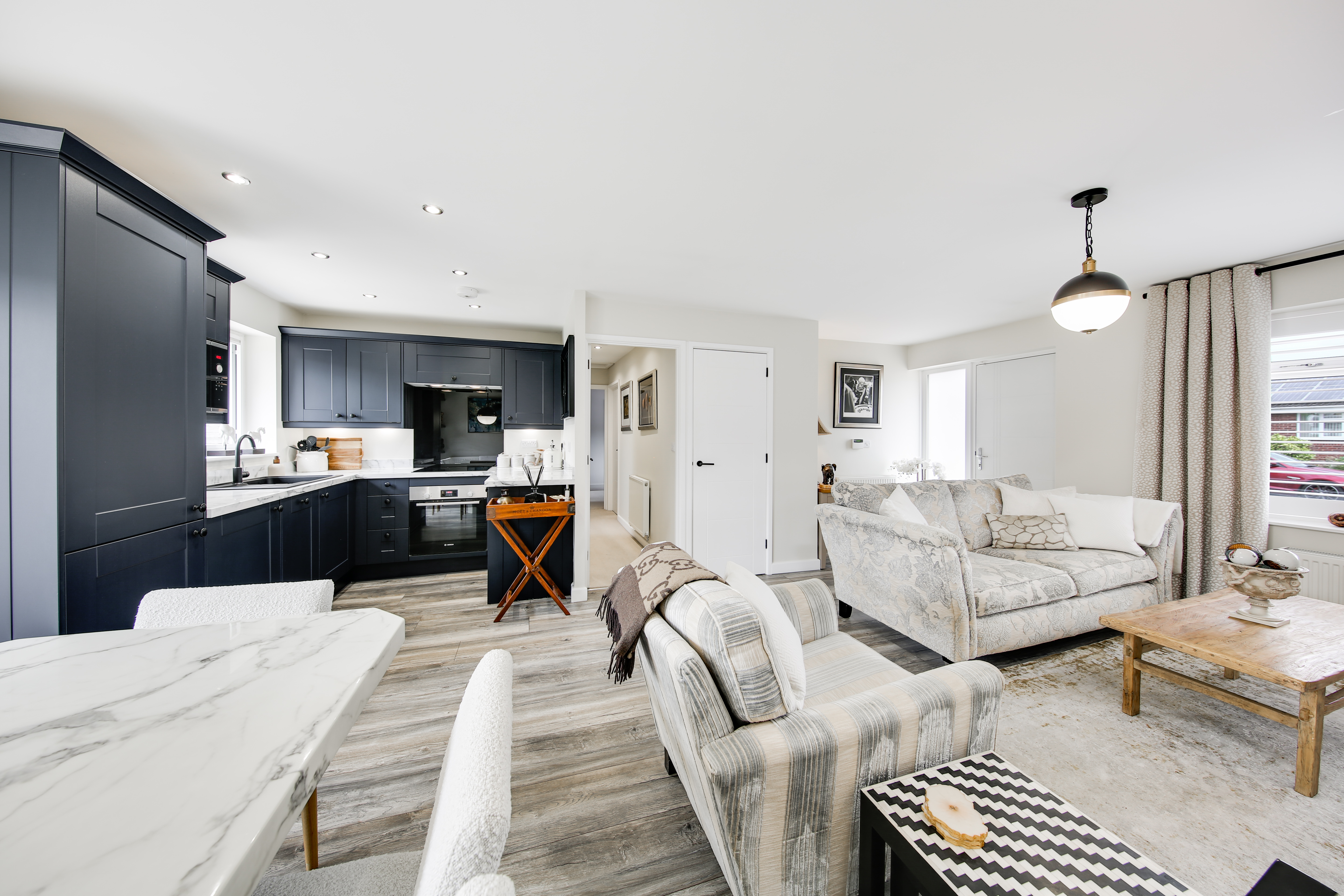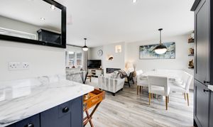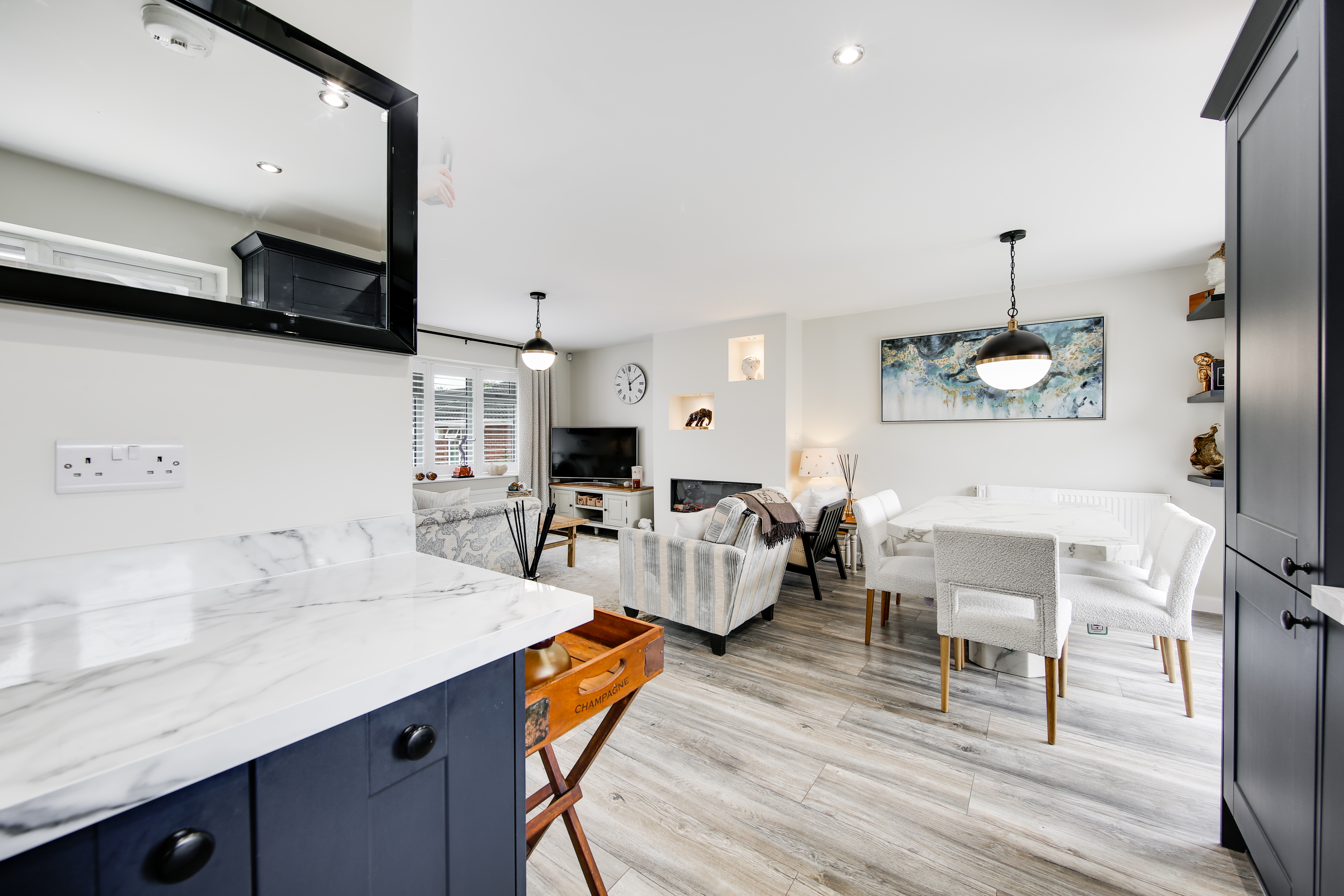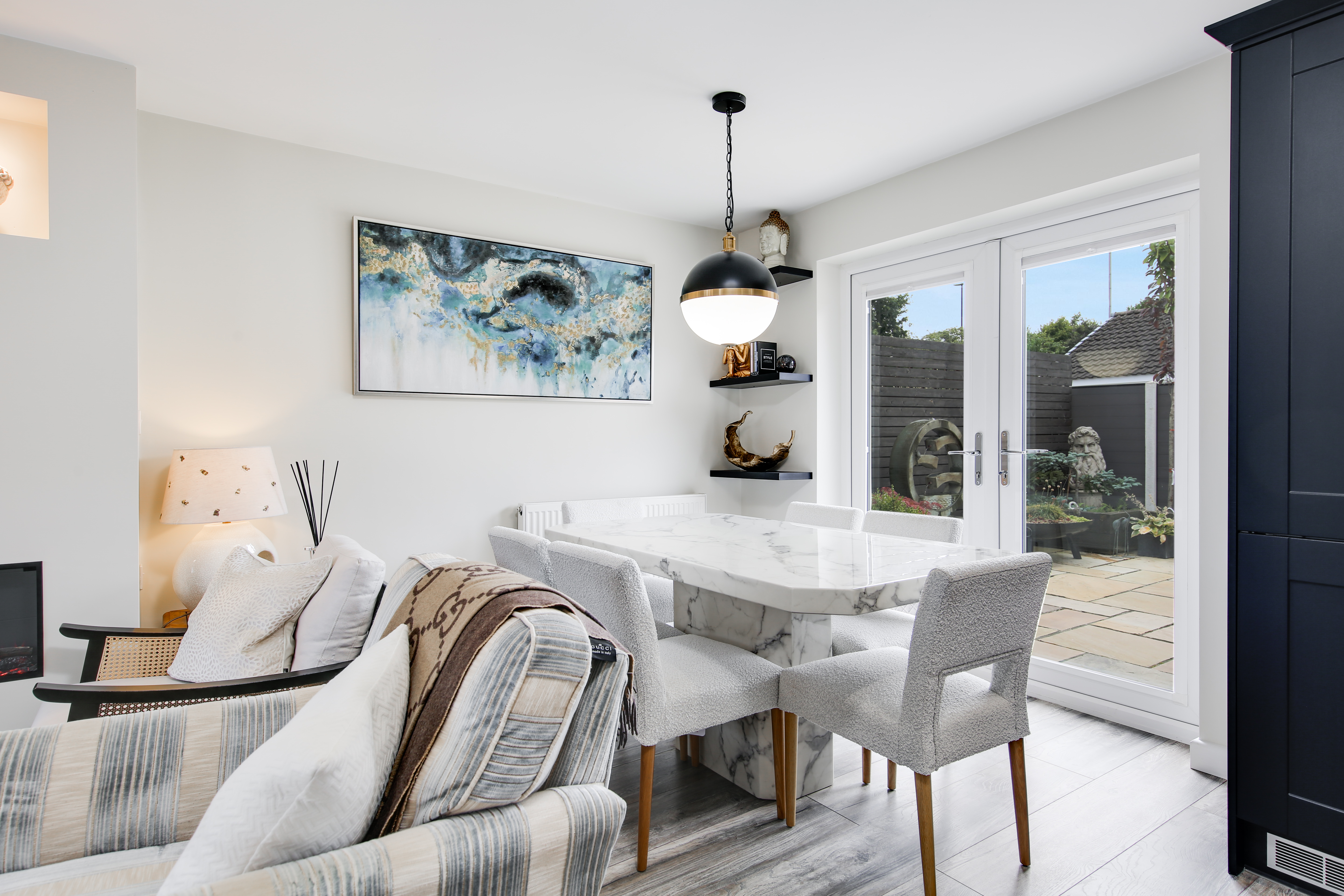 The property exudes elegance and style, boasting a fabulous open plan kitchen and living area. The contemporary designed kitchen features a full range of integrated appliances, quartz sink and marble laminate worktops, creating a space that is both practical and visually impressive. The attention to detail is evident throughout the home, a cosy living area with a feature lighting wall and electric fireplace complementing the accommodation. French doors from the dining area flood the space with natural light.