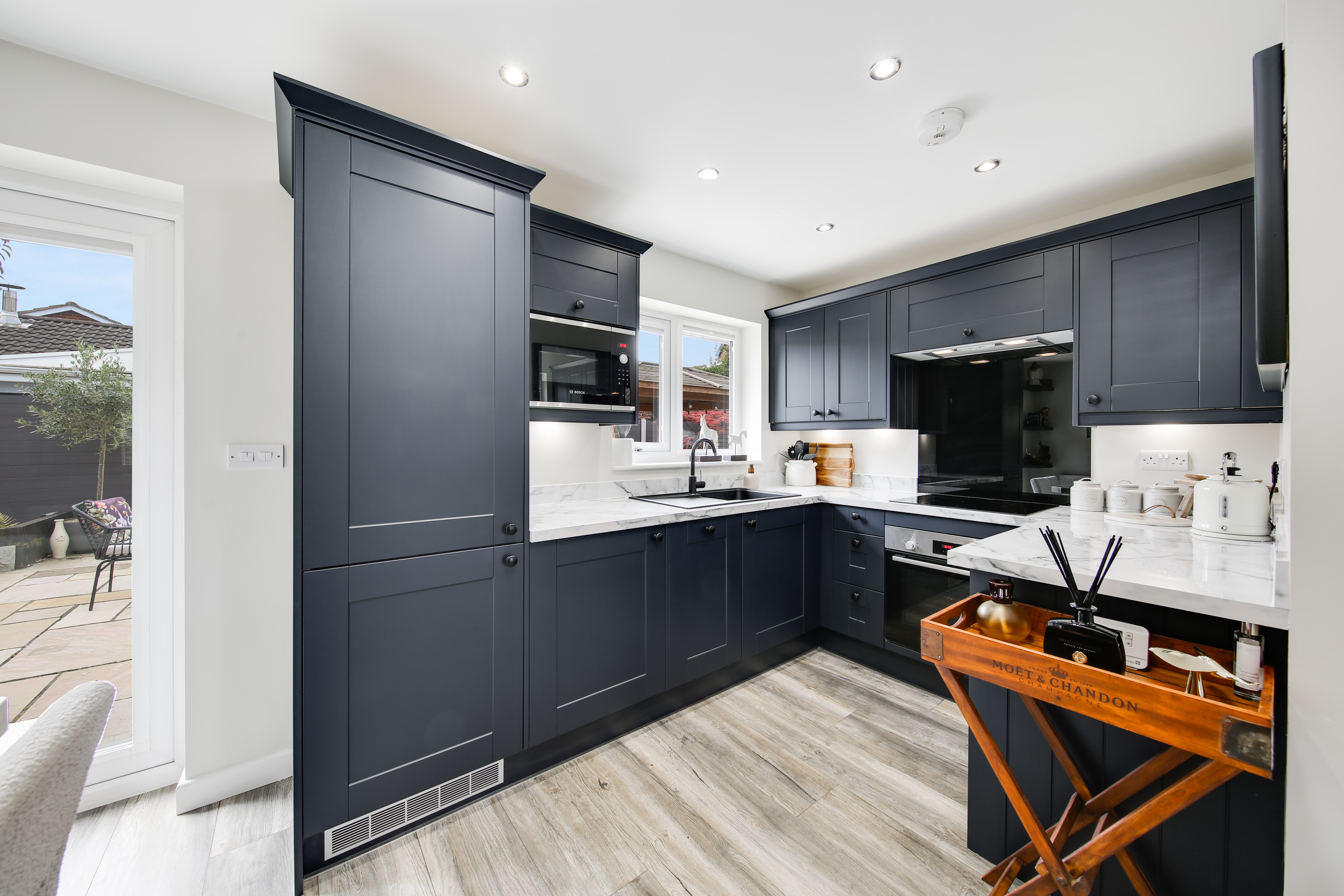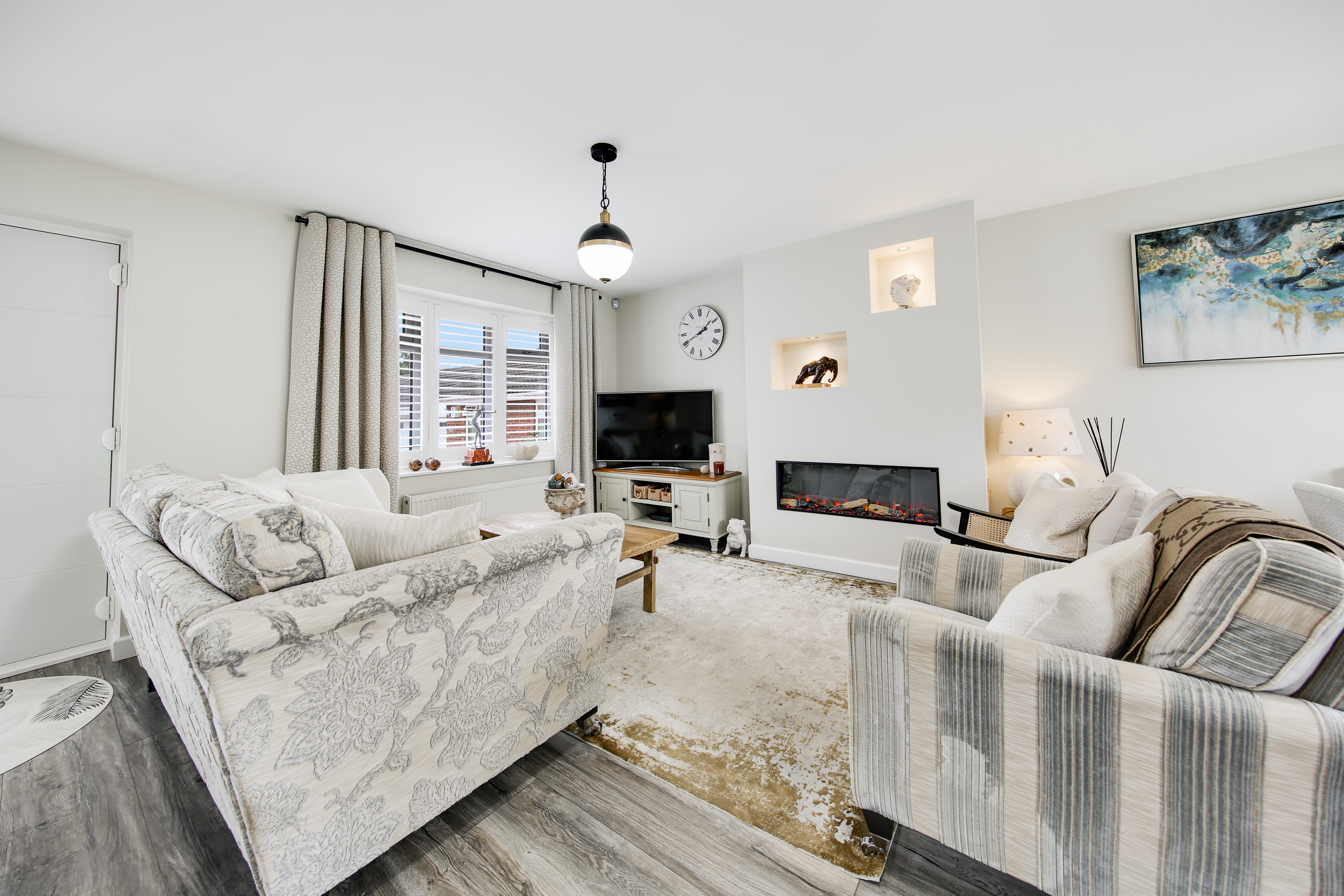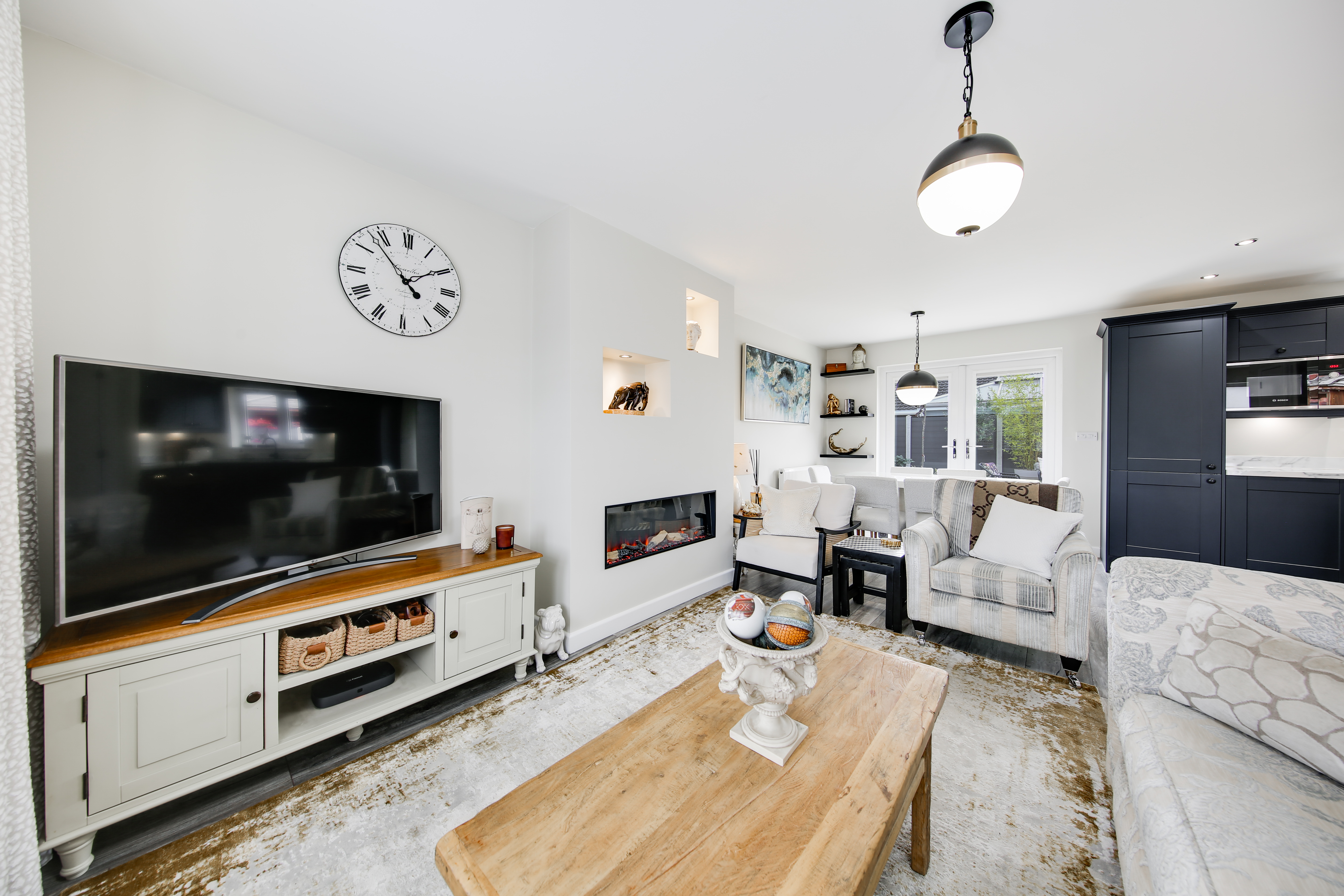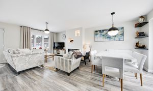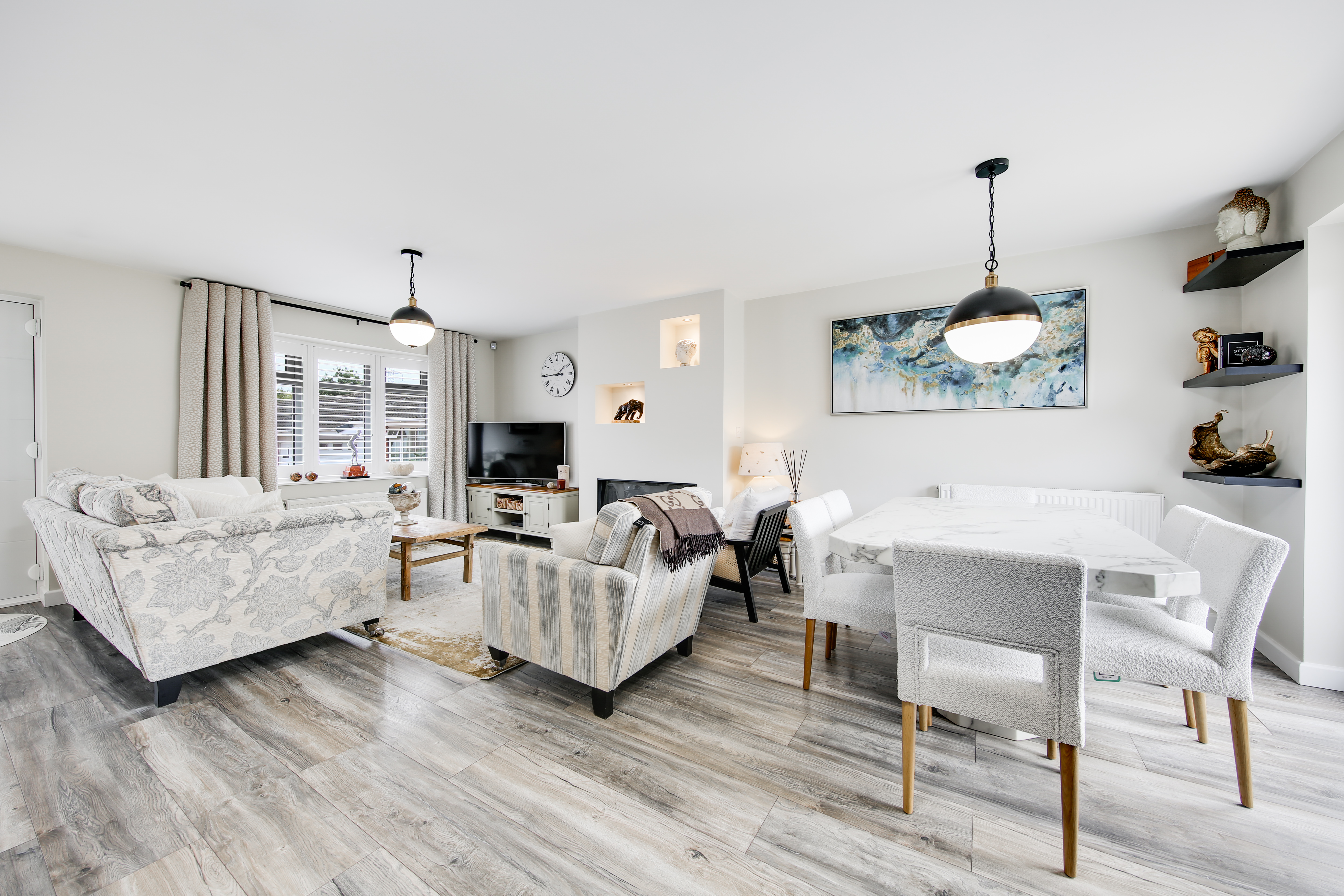 The property exudes elegance and style, boasting a fabulous open plan kitchen and living area. The contemporary designed kitchen features a full range of integrated appliances, quartz sink and marble laminate worktops, creating a space that is both practical and visually impressive. The attention to detail is evident throughout the home, a cosy living area with a feature lighting wall and electric fireplace complementing the accommodation. French doors from the dining area flood the space with natural light.