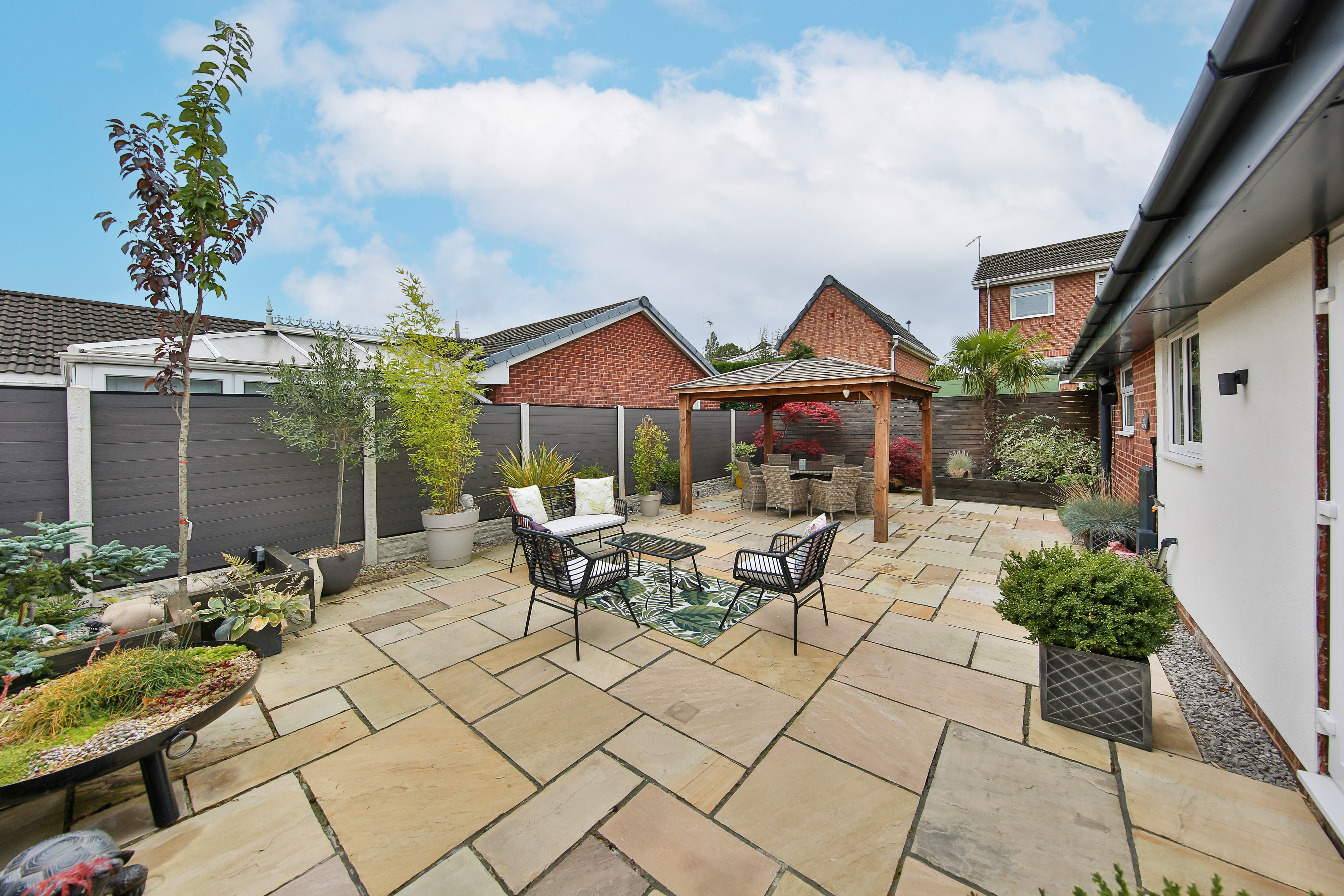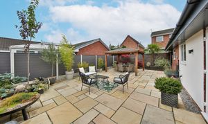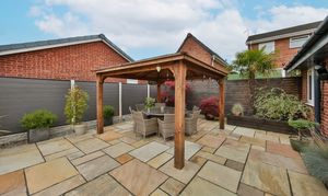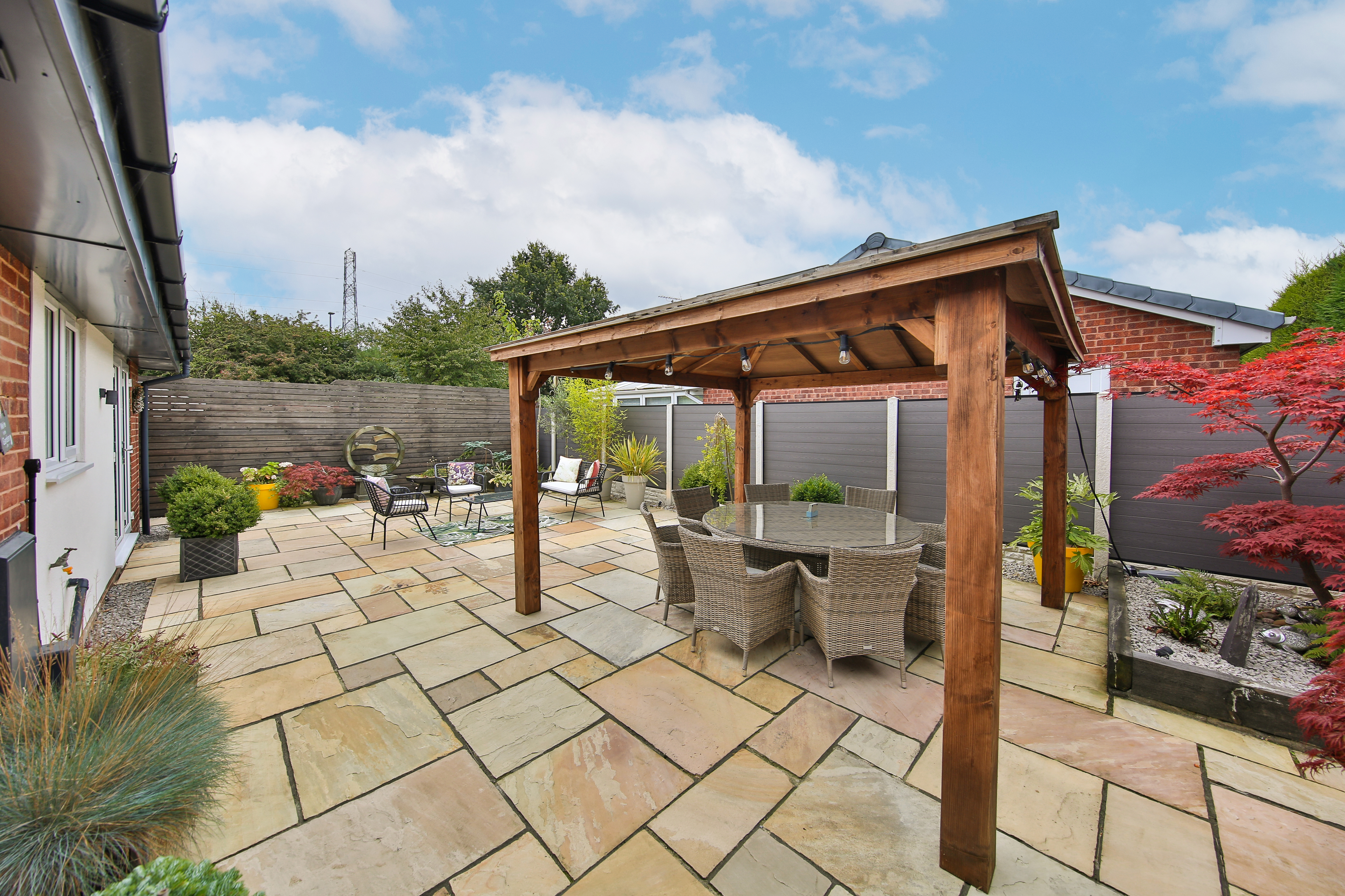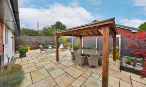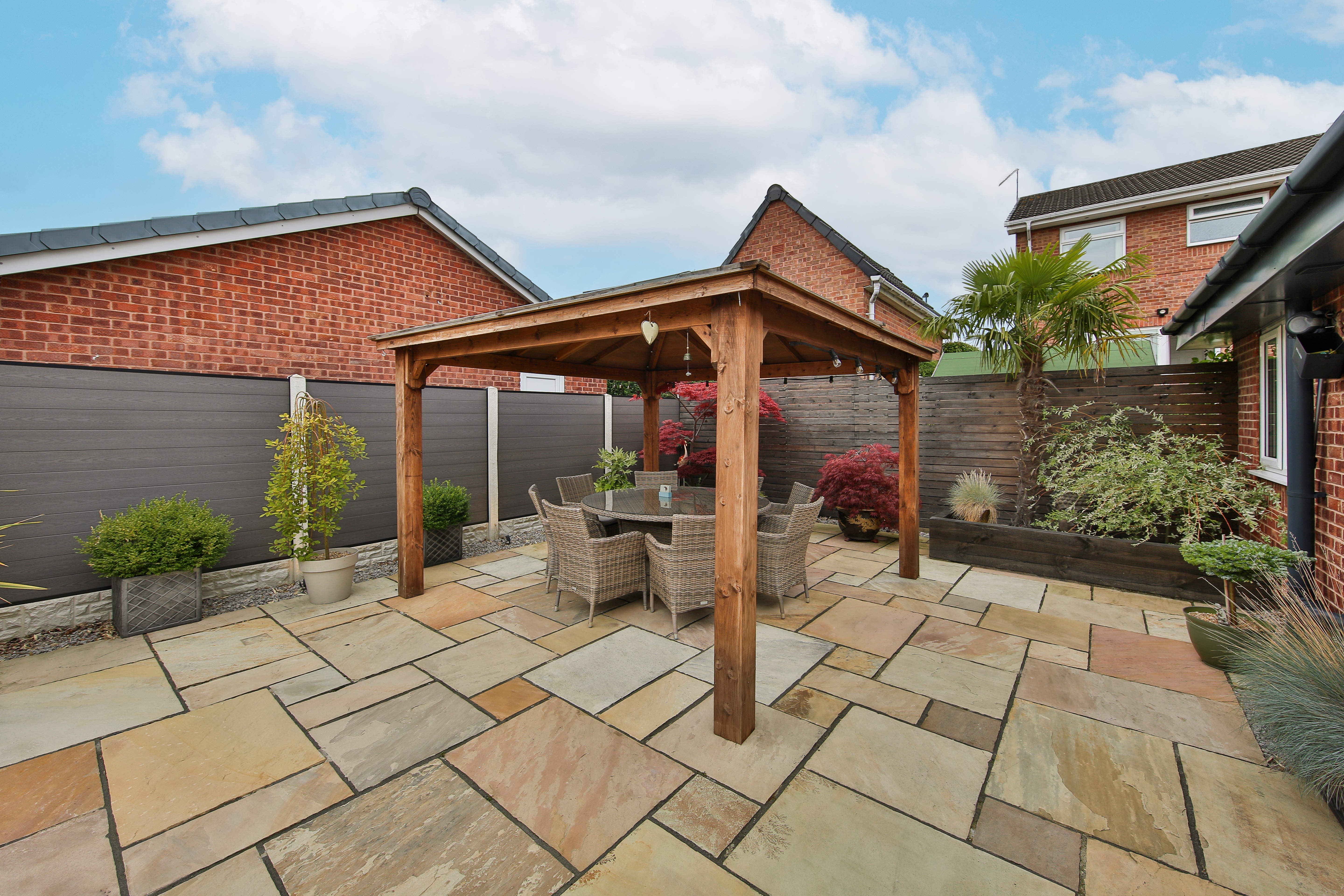 Stepping outside, the property boasts a beautifully landscaped garden that offers a peaceful retreat for both relaxation and outdoor enjoyment. Enclosed for privacy, the garden features a gazebo ideal for alfresco dining along with matured planters and feature lighting. To the front, the property benefits from a paved driveway providing ample off-road parking and detached garage with electric door.