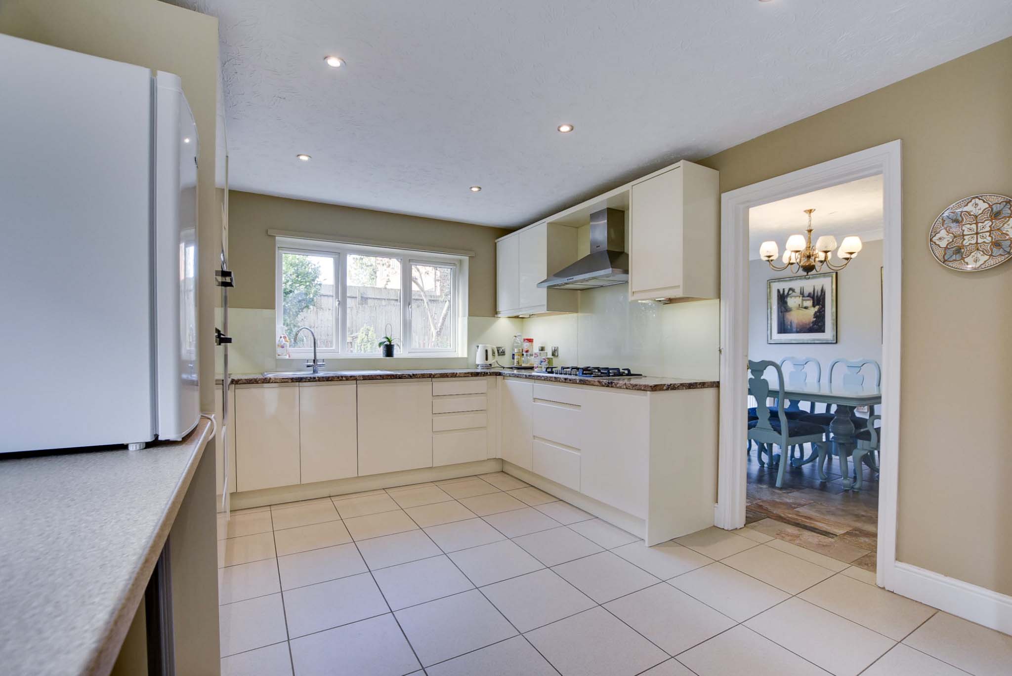 With double glazed window to the rear and side elevations, tiled floor, wall and base units with work surface over, integrated double oven, integrated hob, extractor fan, integrated fridge freezer, integrated dishwasher, one and a half bowl sink and drainer unit, radiator.