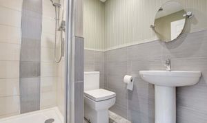 With tiled floor, part tiled walls, low-level WC, wash hand basin, shower cubicle, radiator.