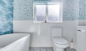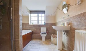 With double glazed window to the side elevation, tiled floor, part tiled walls, bath, low-level WC, wash hand basin, ladder towel rail/radiator.