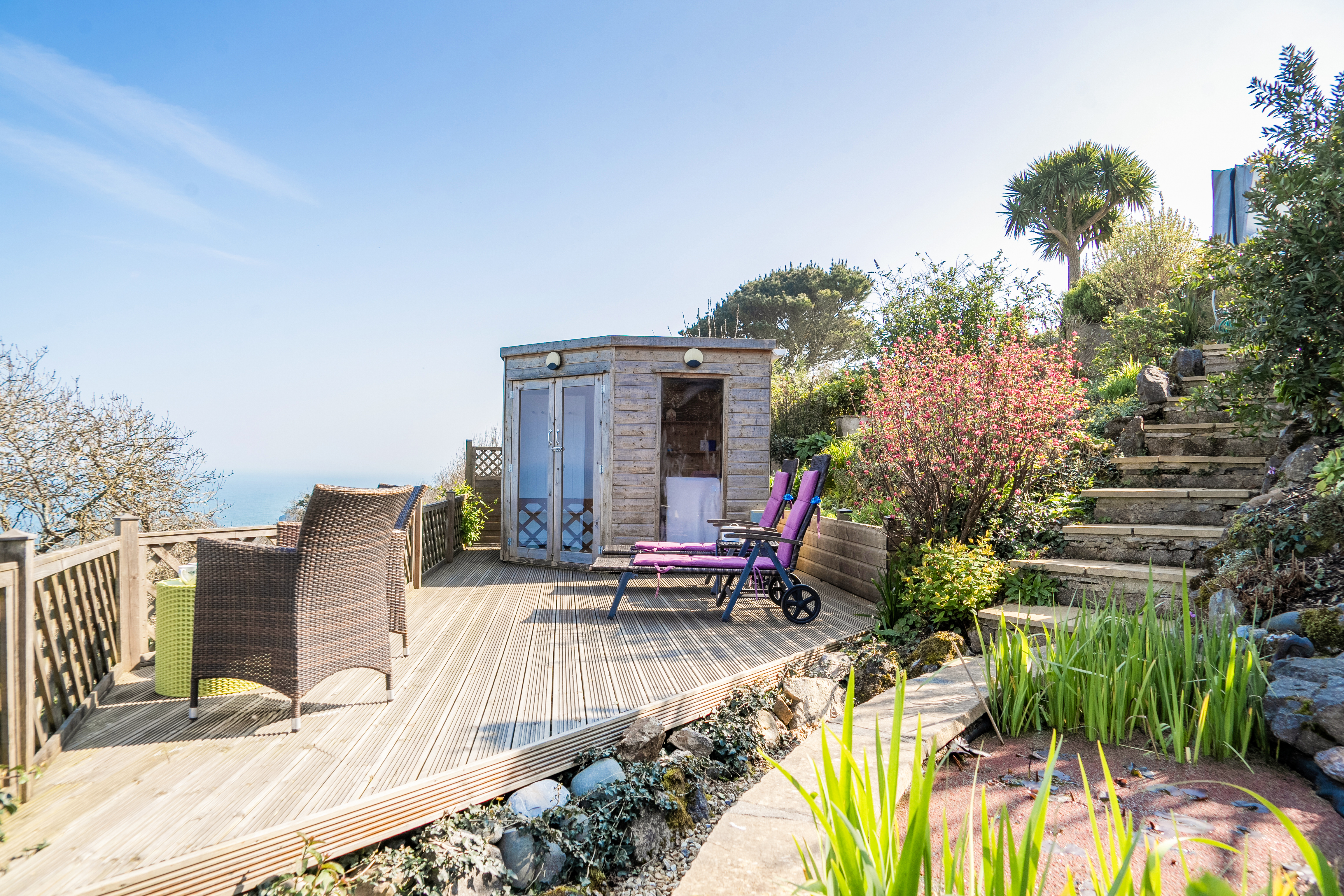 Further steps lead to a lower level, where seating is perfectly positioned to take in the dramatic coastline of Hope's Nose. Here a small pond and an additional decked area with a fully serviced summerhouse provide the ideal setting for intimate evenings under the stars. Beyond the garden boundary, a natural area of foliage, which belongs to the property, stretches down to the coast path. This low-maintenance space looks after itself, preserving both privacy and a sense of wild tranquillity.