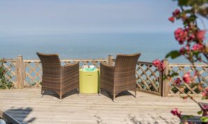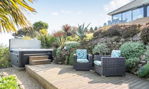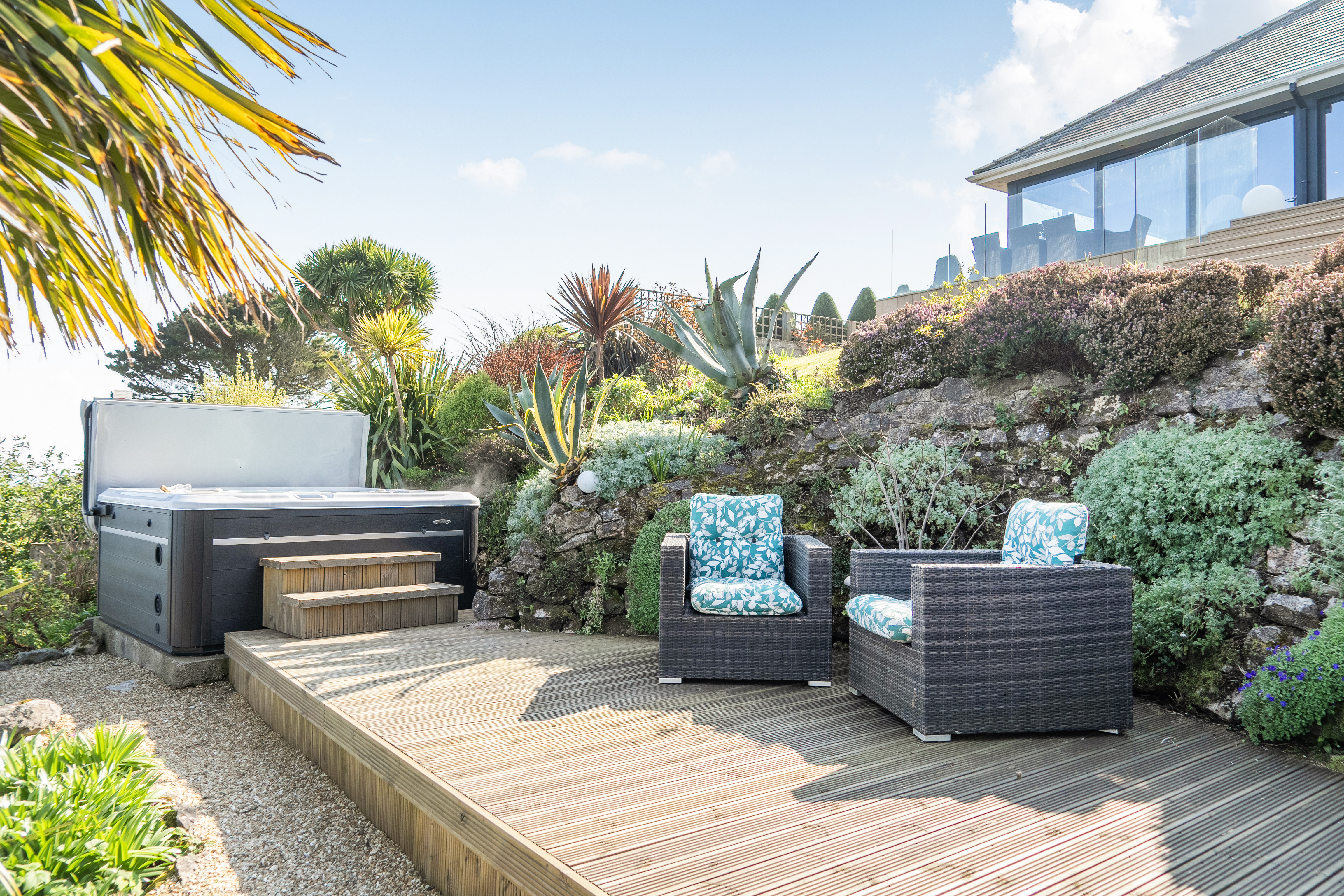 A charming side path winds through a small orchard, where apple, plum, damson and cherry trees flourish, offering both beauty and seasonal fruit. The garden is enriched with a variety of perennials, shrubs, and iconic Torbay palm trees, creating texture, movement and year-round interest. Meandering steps guide you to a decked area complete with a three-year-old hydro pool hot tub, surrounded by seating—an idyllic spot to relax while watching the ever-changing seascape.