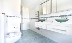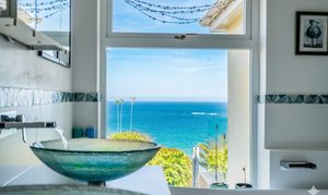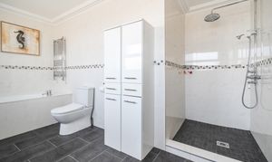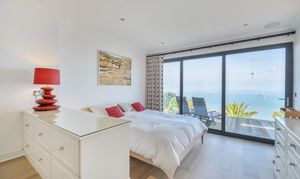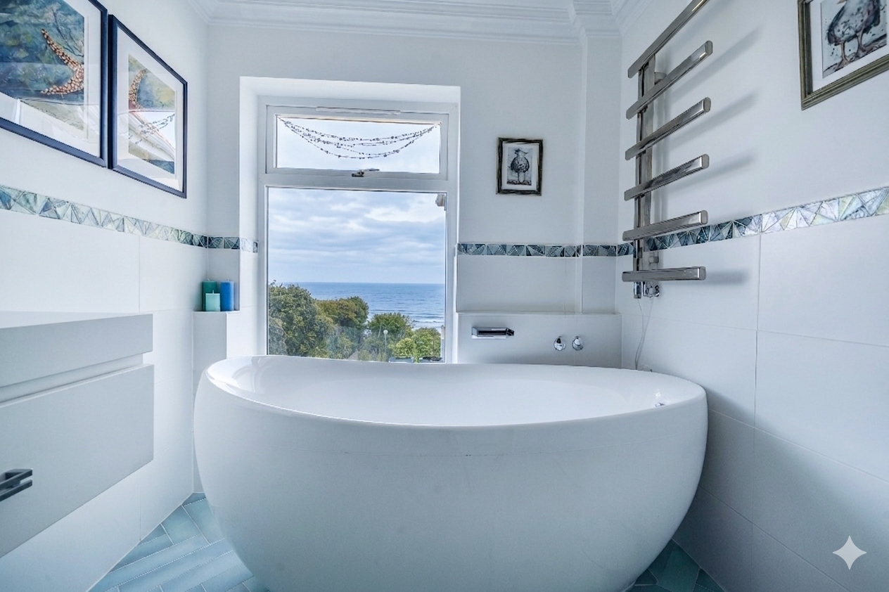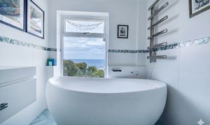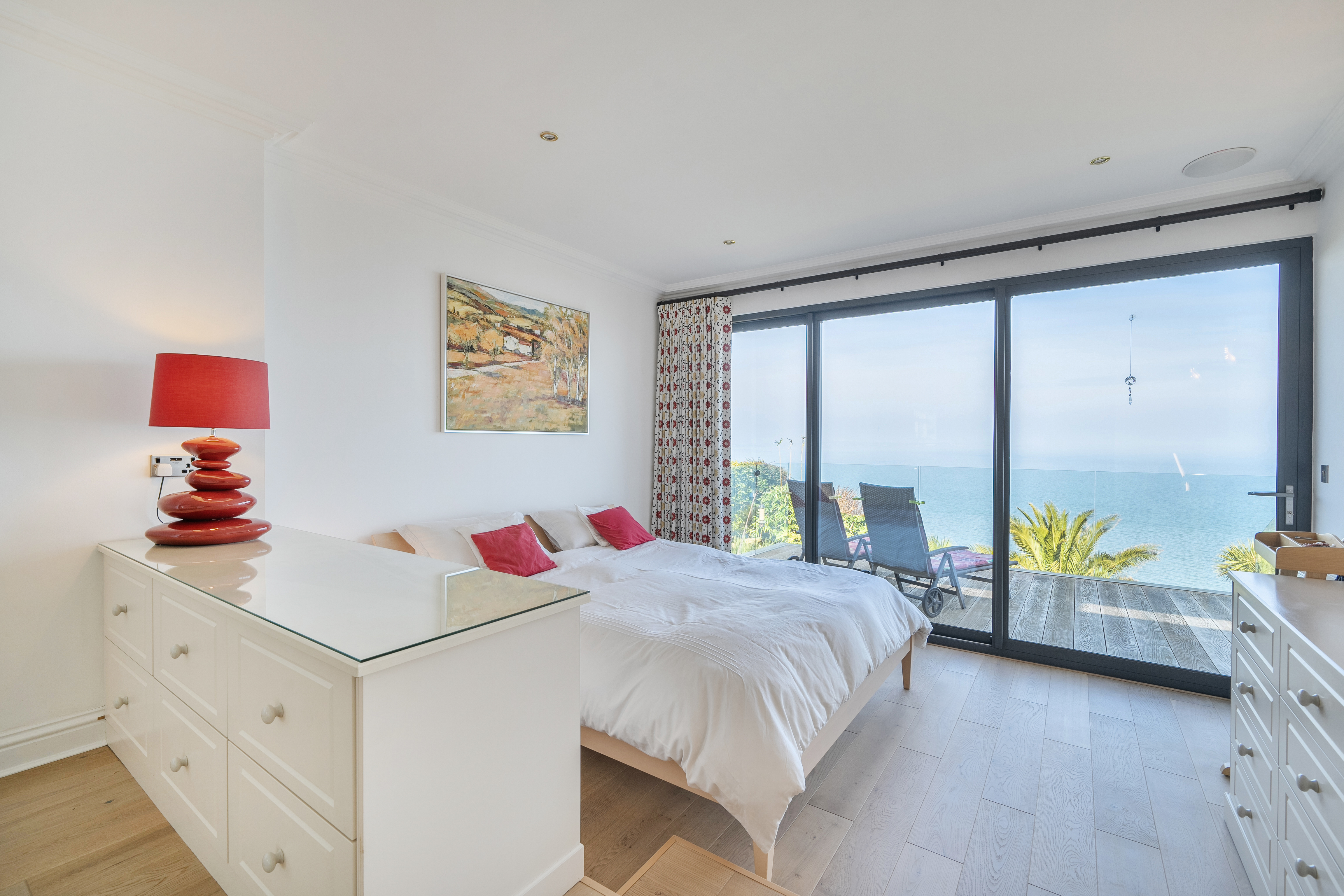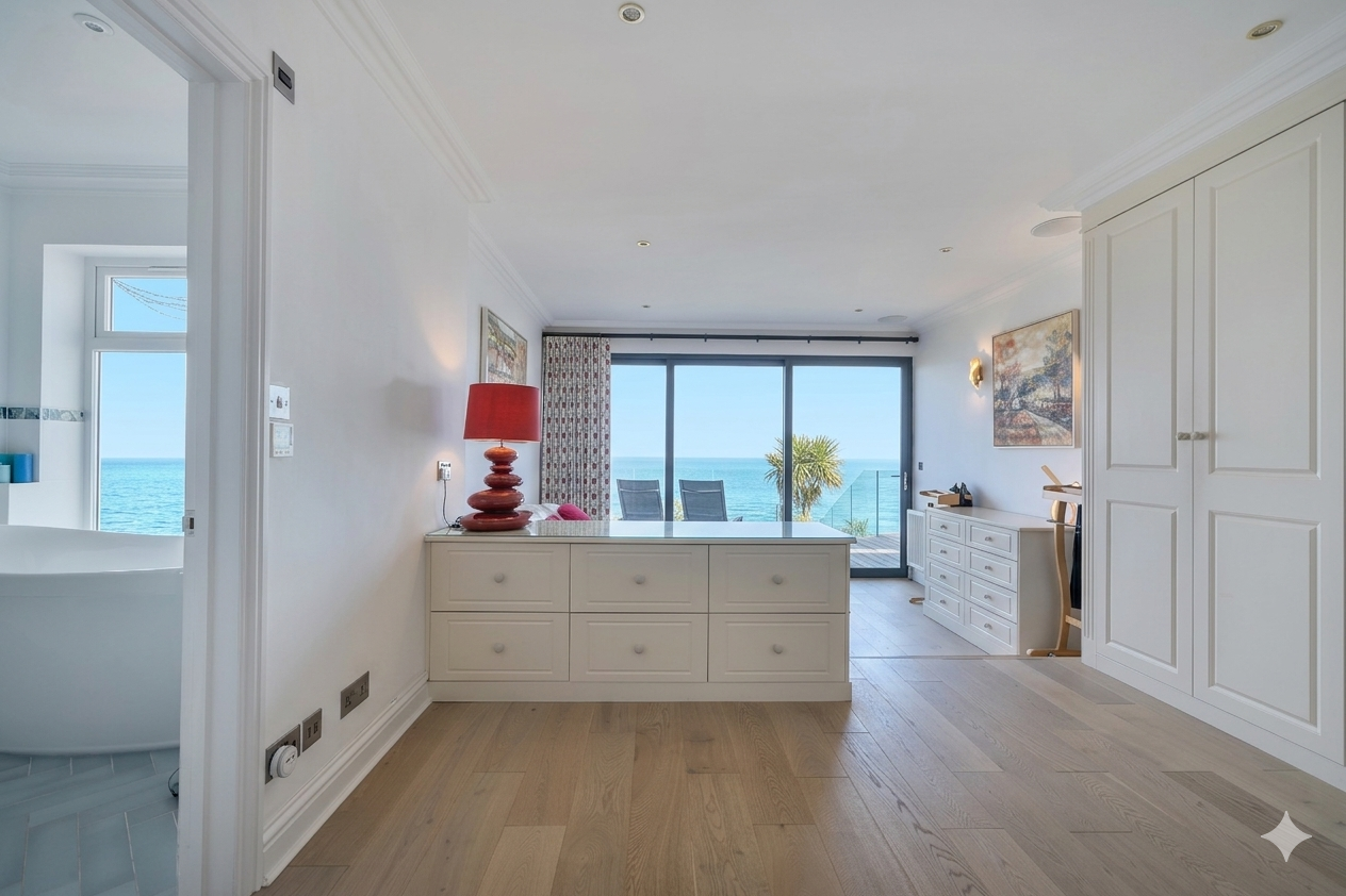 The principal bedroom is a sanctuary in every sense. Thoughtfully arranged with a dressing area leading down to the sleeping space, it is a room designed around the view. Sliding doors open directly onto the terrace, inviting you to start each day with fresh sea air and uninterrupted coastal panoramas. The en-suite is indulgent and beautifully crafted, with independent underfloor heating and bespoke double sinks inspired by the movement of water, an oval bath perfectly positioned for long, restorative soaks overlooking the ocean, and a spacious walk-in shower.