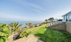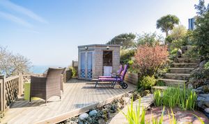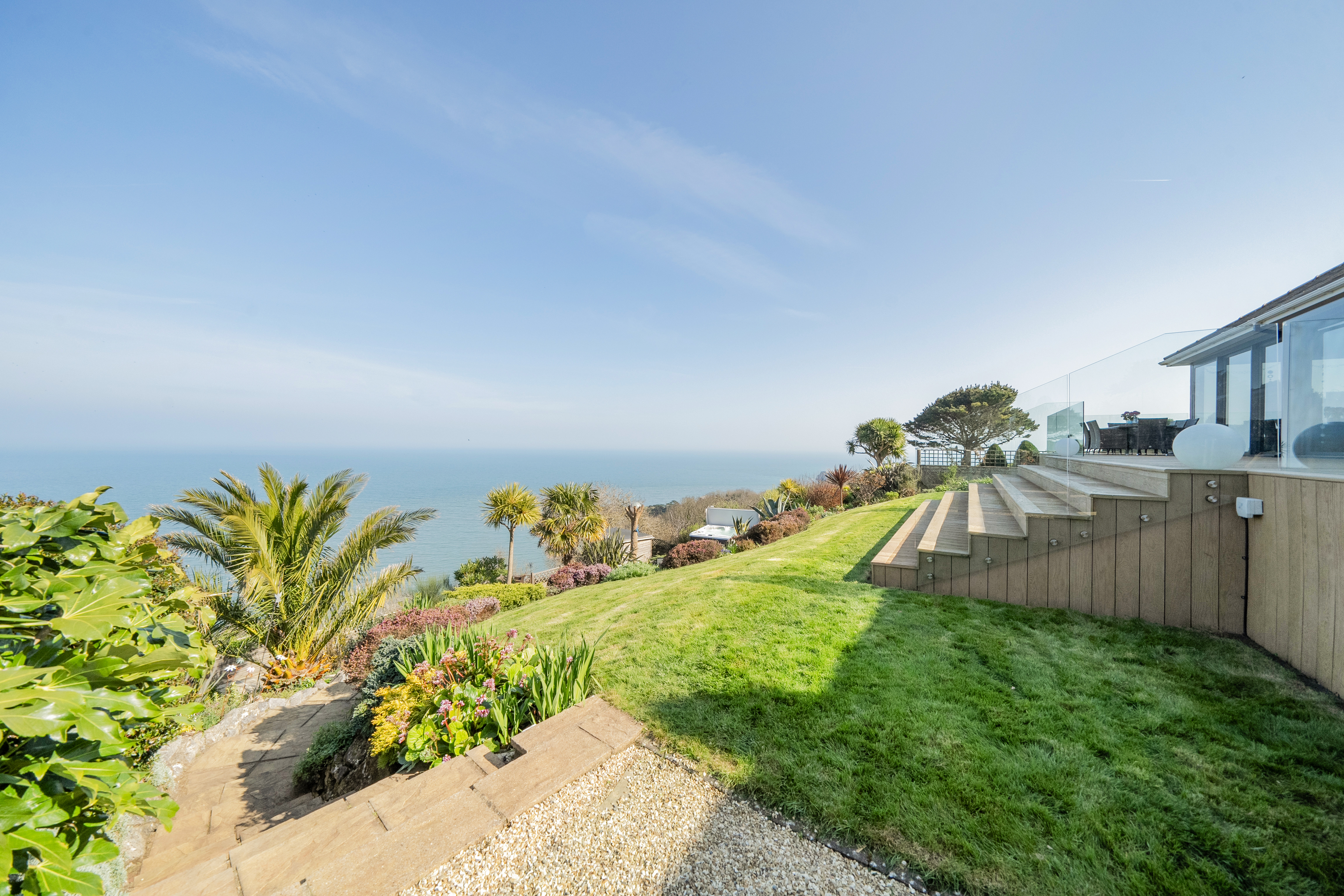 The front garden sets the tone for the lifestyle this home offers—an oasis of calm, privacy and coastal charm. Set back from the road, it provides secluded areas for quiet reflection or casual conversation, all framed by sea views stretching towards Thatcher Rocks. Carefully landscaped with attractive slate and centred around a contemporary water feature, the garden is both visually striking and a serene retreat. Sunny and sheltered, it even supports the growth of citrus fruits, adding a subtle Mediterranean feel to the setting. Side gated access leads you to the garden where you find the large terrace from the living space, laid in Millboard, a luxury component, with steps descending to a lush lawn and the mature, established planting beyond.