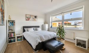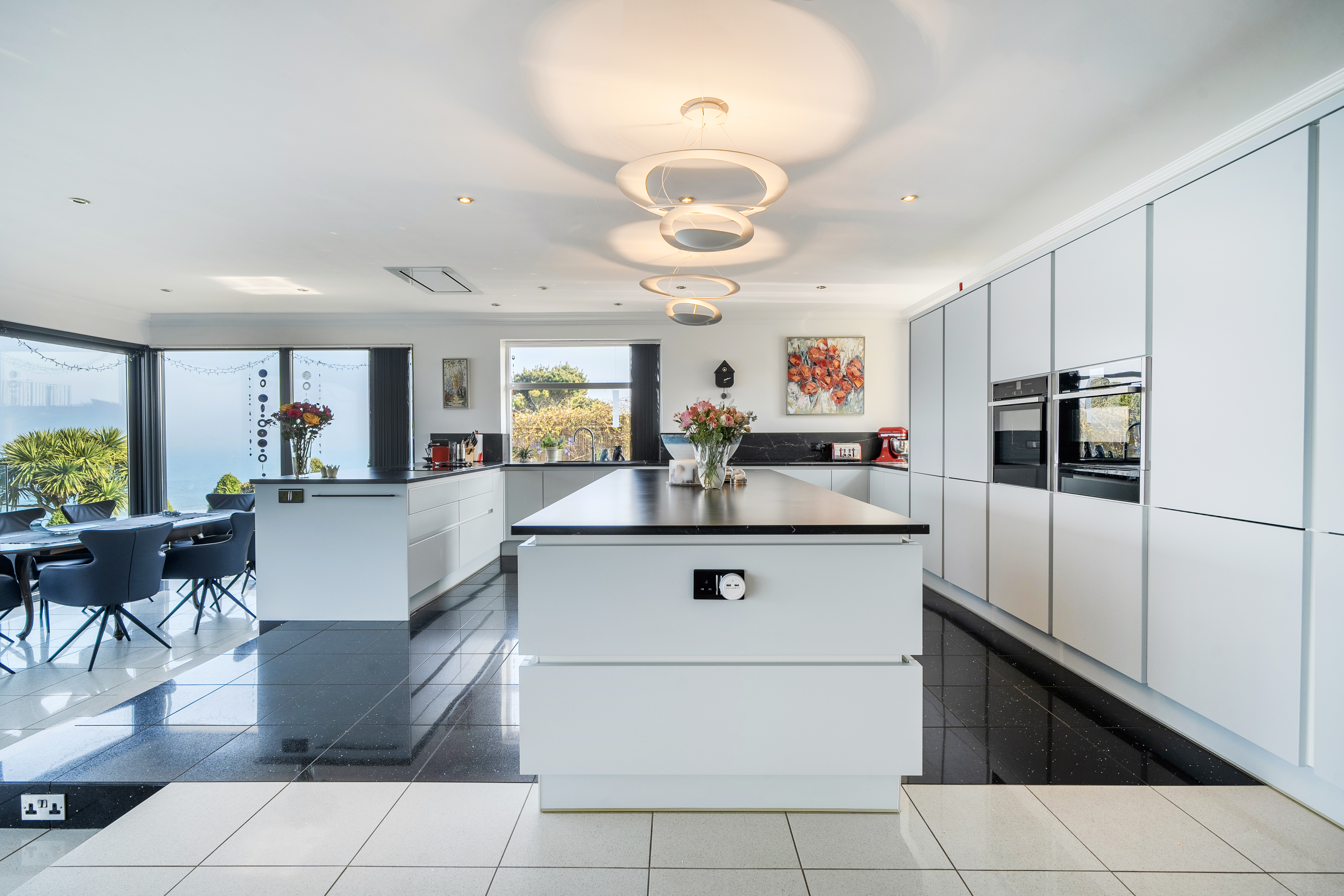 The kitchen, installed in 2022, is as functional as it is beautiful—sleek quartz black worktops paired with soft sea foam tone cabinetry create a calming, coastal palette. Fully integrated appliances from NEFF along with a ceiling-mounted Faber extractor and a Quooker instant hot water tap ensure everything is in place for both everyday cooking and hosting on a larger scale. The substantial kitchen island becomes a natural gathering point—morning breakfasts, casual conversations, or a glass of wine while dinner is prepared.