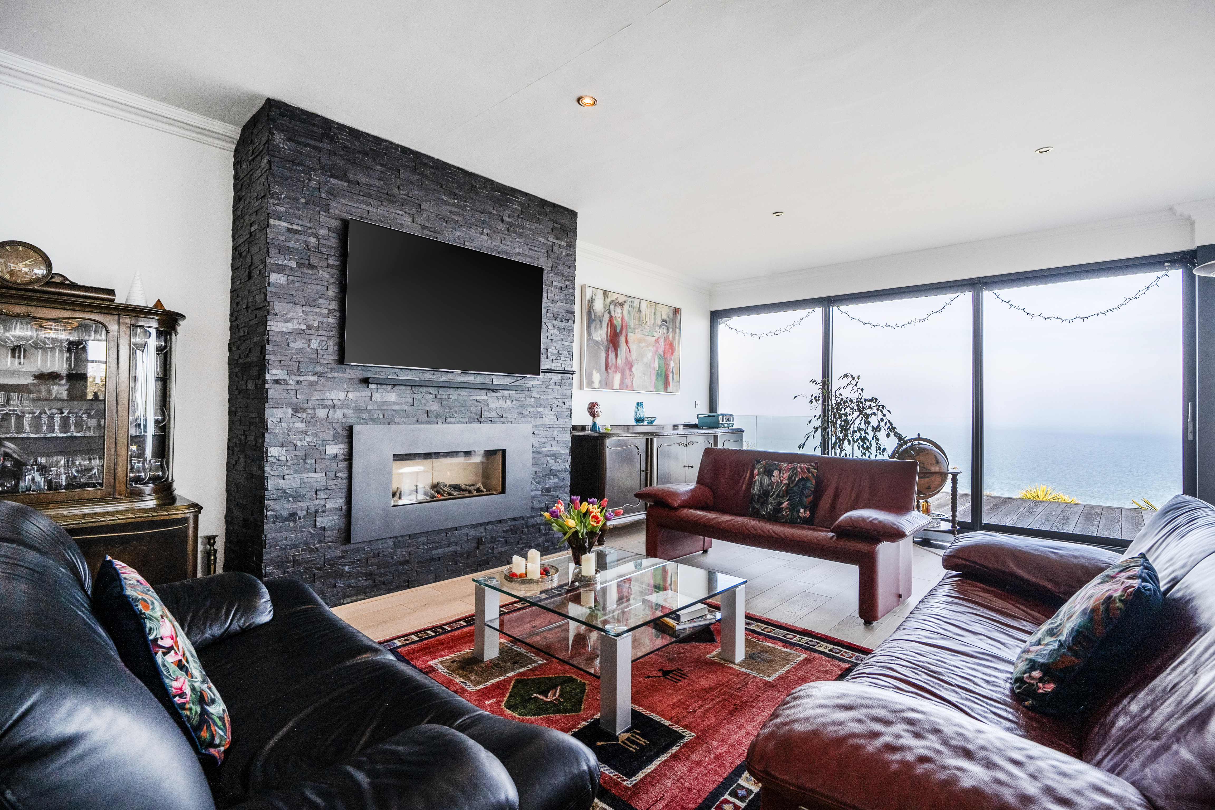 The dining area is surrounded by glazing, meaning every meal is accompanied by a changing seascape, while the adjoining seating area is perfectly positioned to pause and simply take it all in. The living area, centred around a gas fire with a slate chimney breast and warm wooden flooring, offers a cosy contrast—ideal for cooler evenings, where the glow of the fire meets the ever-present horizon beyond.