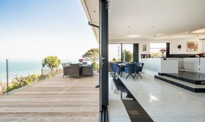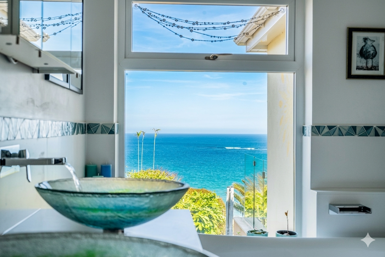 Stepping through the landscaped front garden, there is an immediate sense that this is a home designed not just to be lived in, but to be experienced. The entrance hallway sets the tone—light dances across subtly sparkling ceramic tiles, and almost instinctively your eyes are drawn forward, through the home and out to the endless blue of the sea beyond. It is a view that stops you in your tracks, and one that will quietly shape everyday life here.