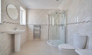 The remaining bedrooms continue this sense of comfort and quality. Bedroom two, with its striking glazed feature, with shutters, overlooking the snug, bespoke finishes and private en-suite, offers a stylish and secluded guest space. Bedroom three, overlooking the front garden, provides equally luxurious accommodation with its own beautifully appointed en-suite, ensuring every occupant enjoys both privacy and refinement.